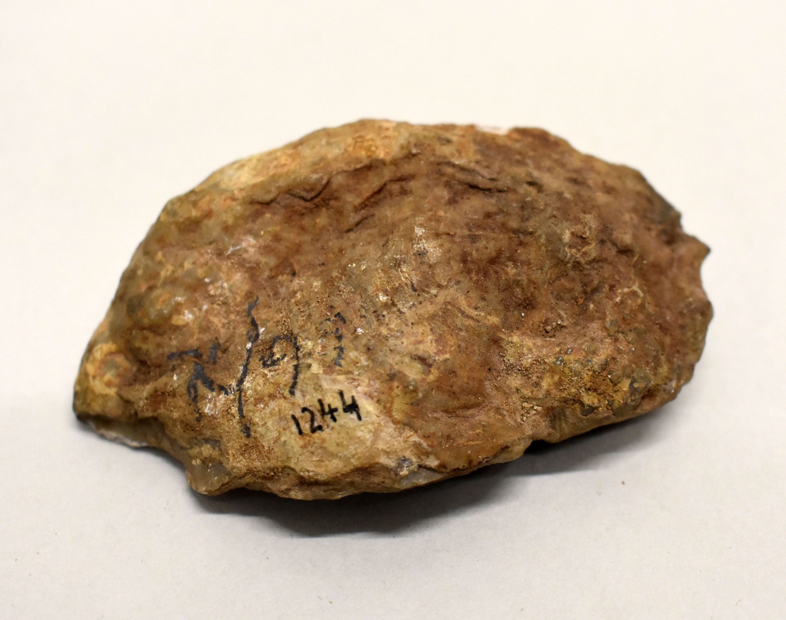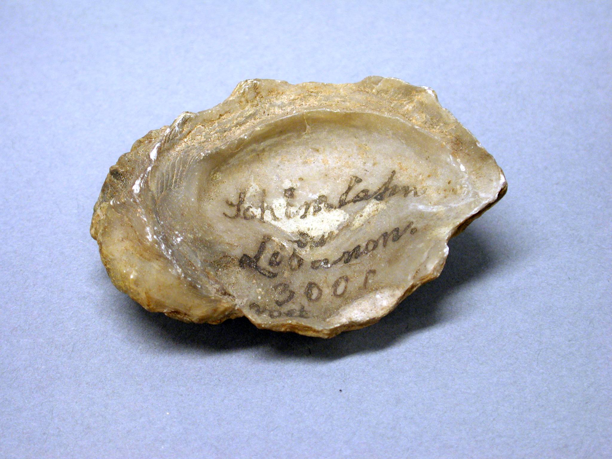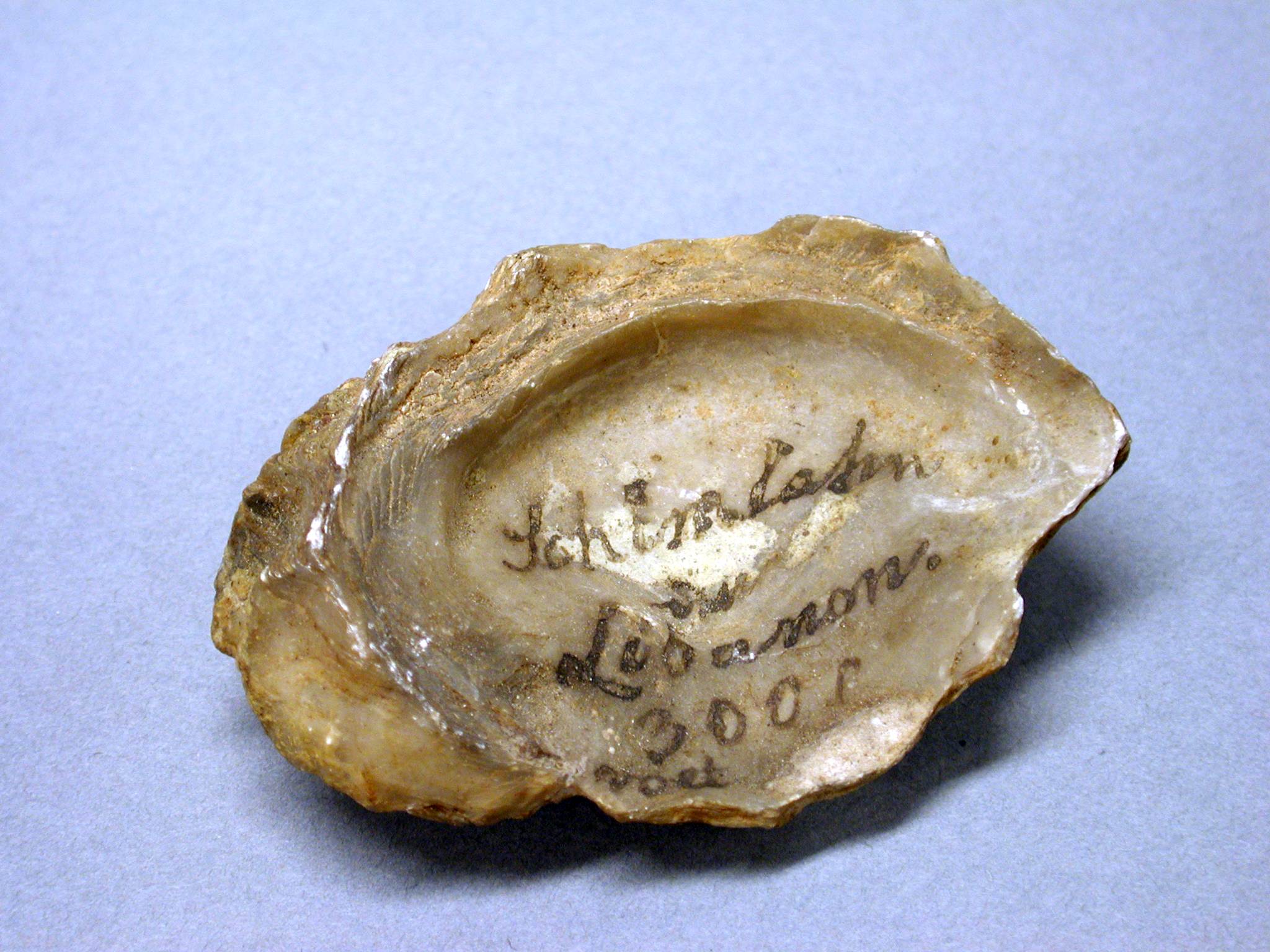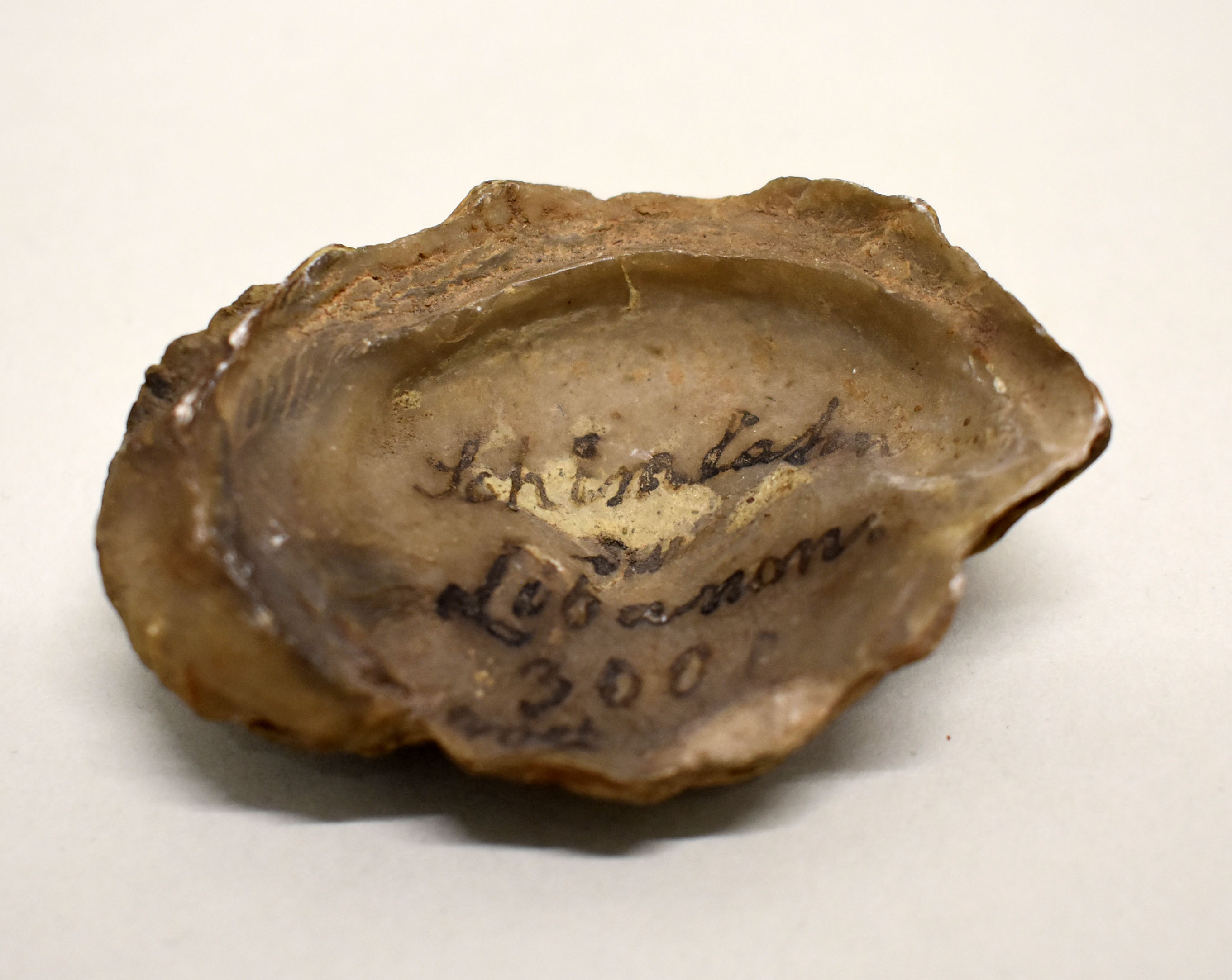 op het oude tekstkaartje stond het volgende: '103 Versteende Ammoniet van de Libanon, meegebracht in 1869 door de heer Pim, kapitein in het Engels leger, echtgenoot van Mirjam Cachet'