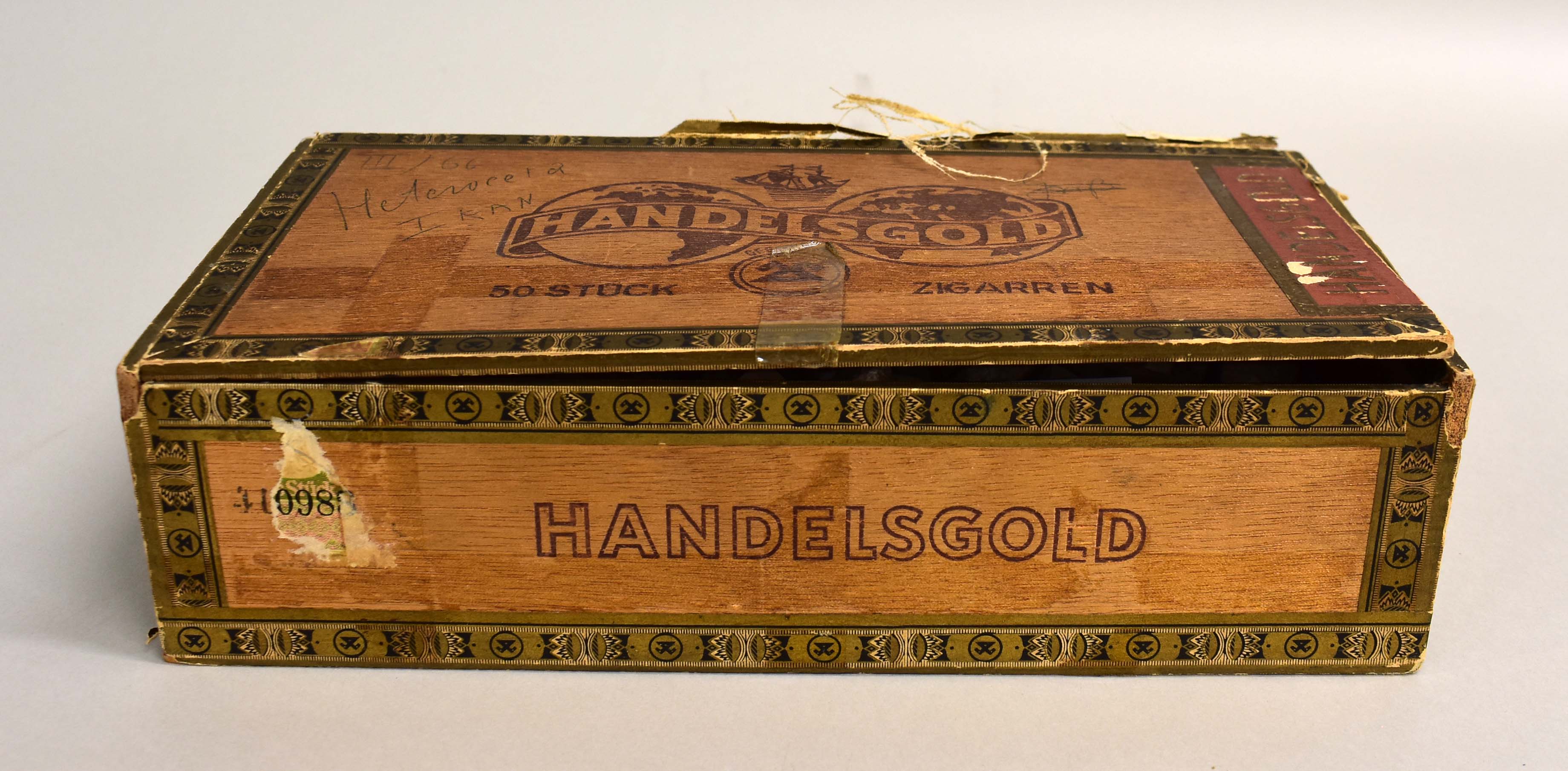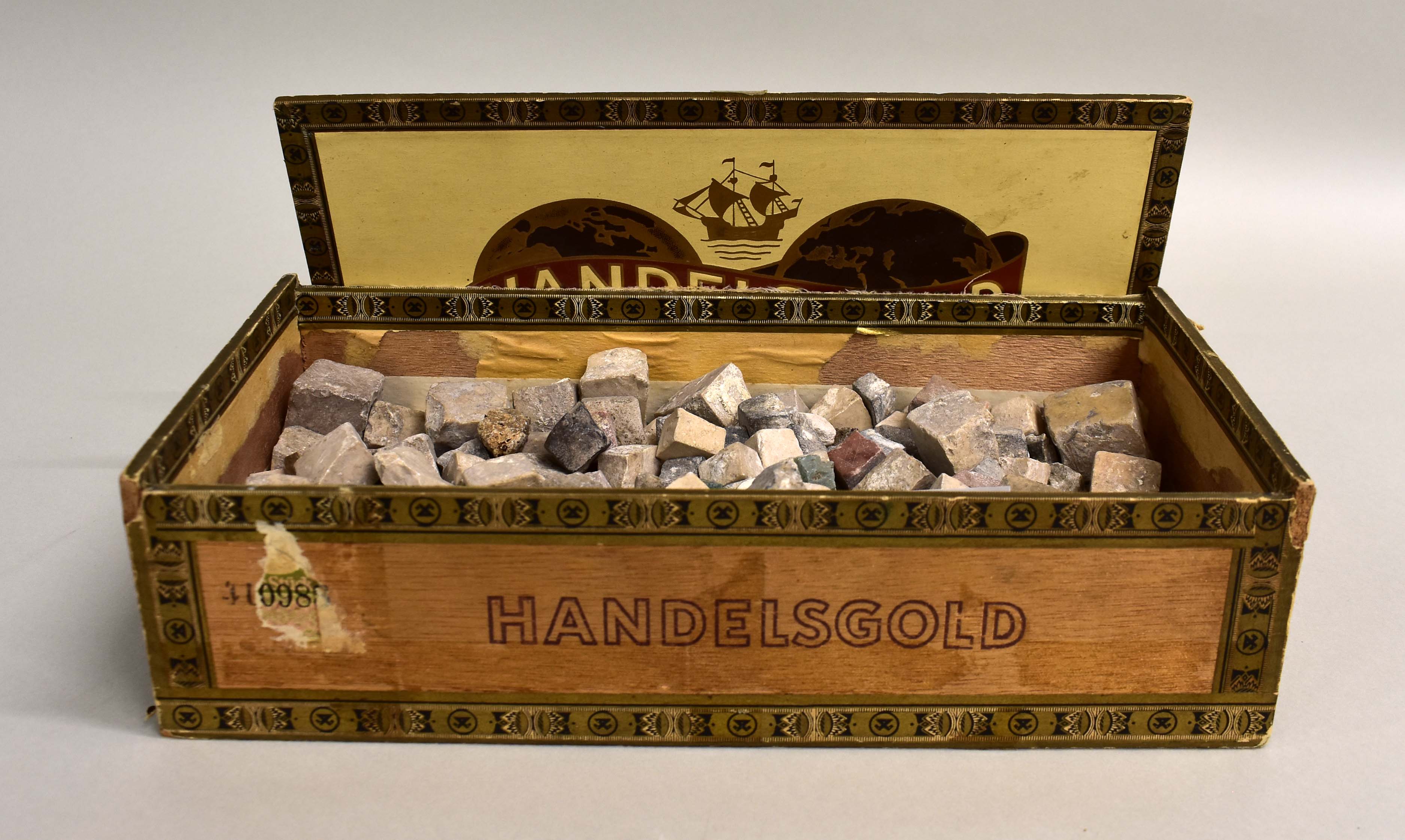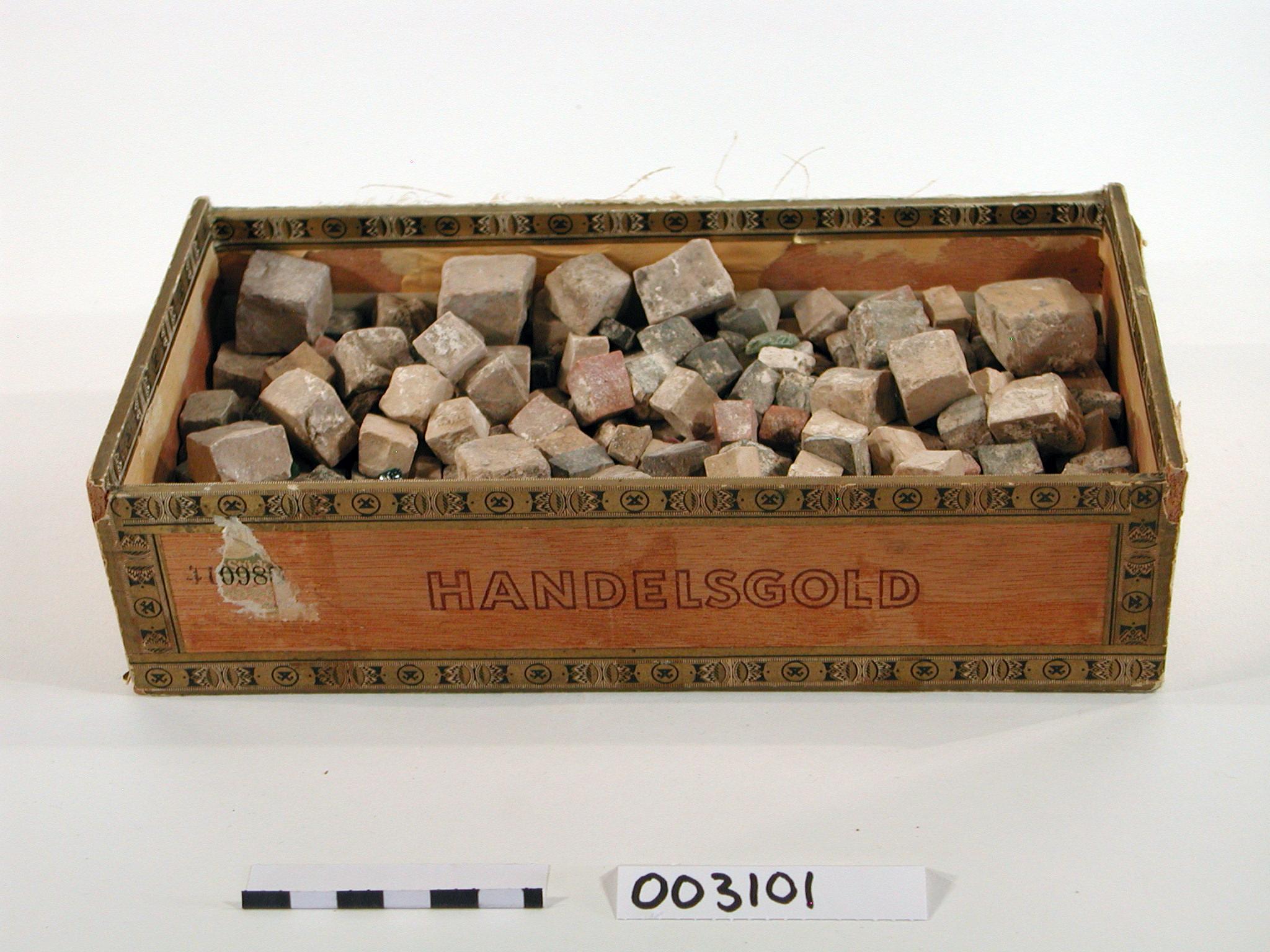 Houten sigarenkistje met mozaieksteentjes van de Tempelberg