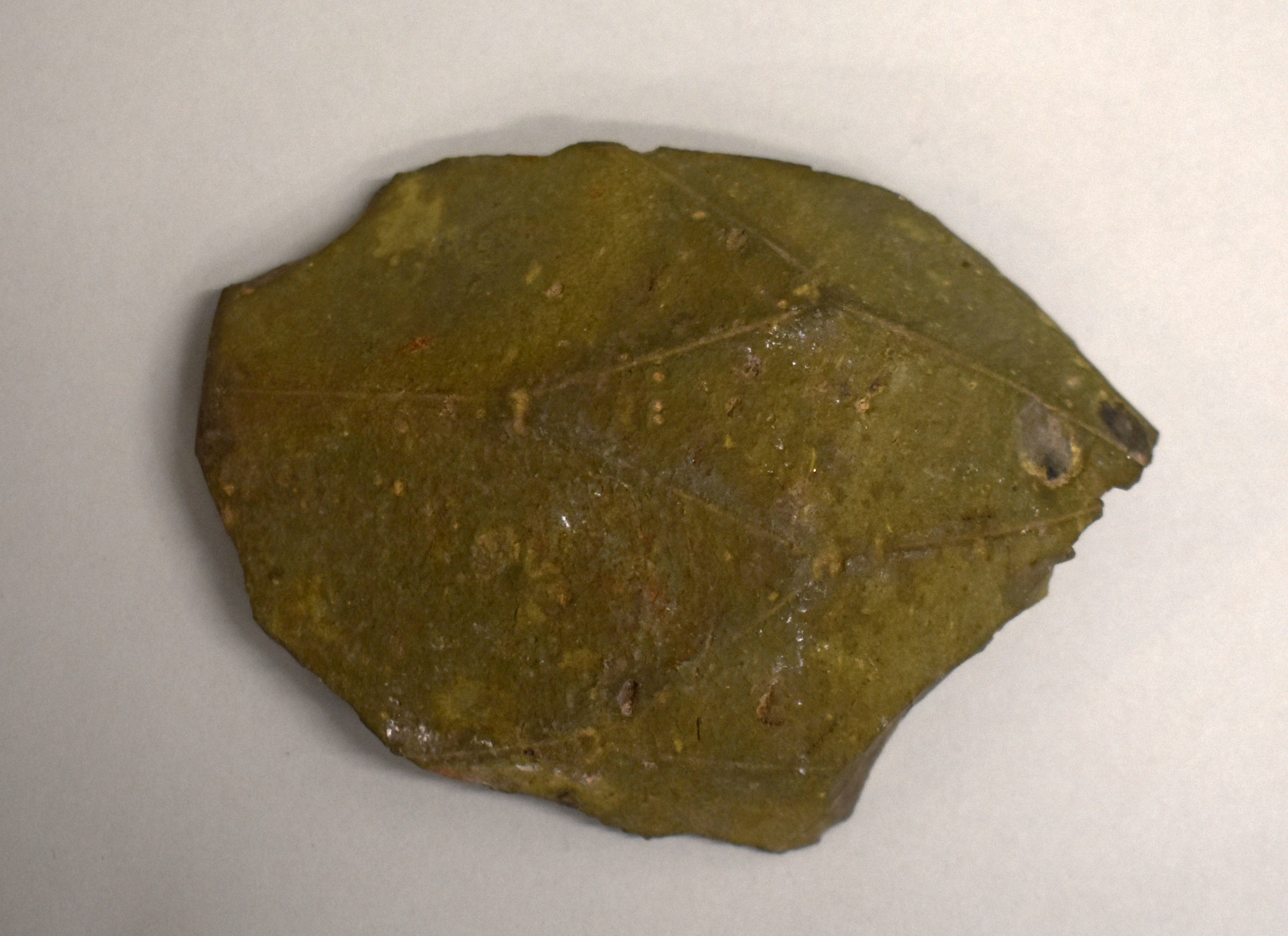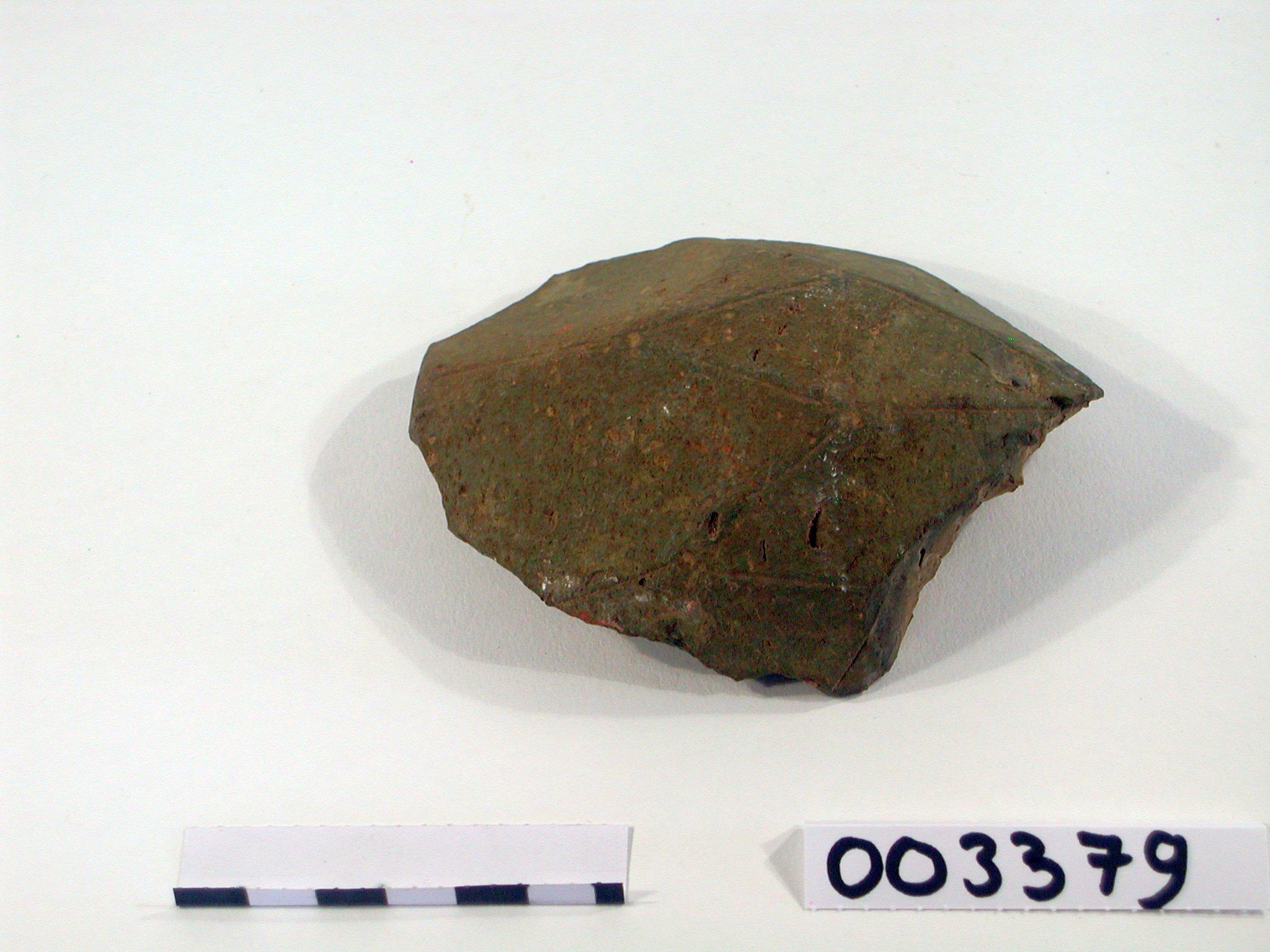 Groenachtig hol fragment van vaas met langwerpig ruitmotief zoals een schild van een schildpad, met in één zijde duidelijk in reliëf een rad/spaakwiel