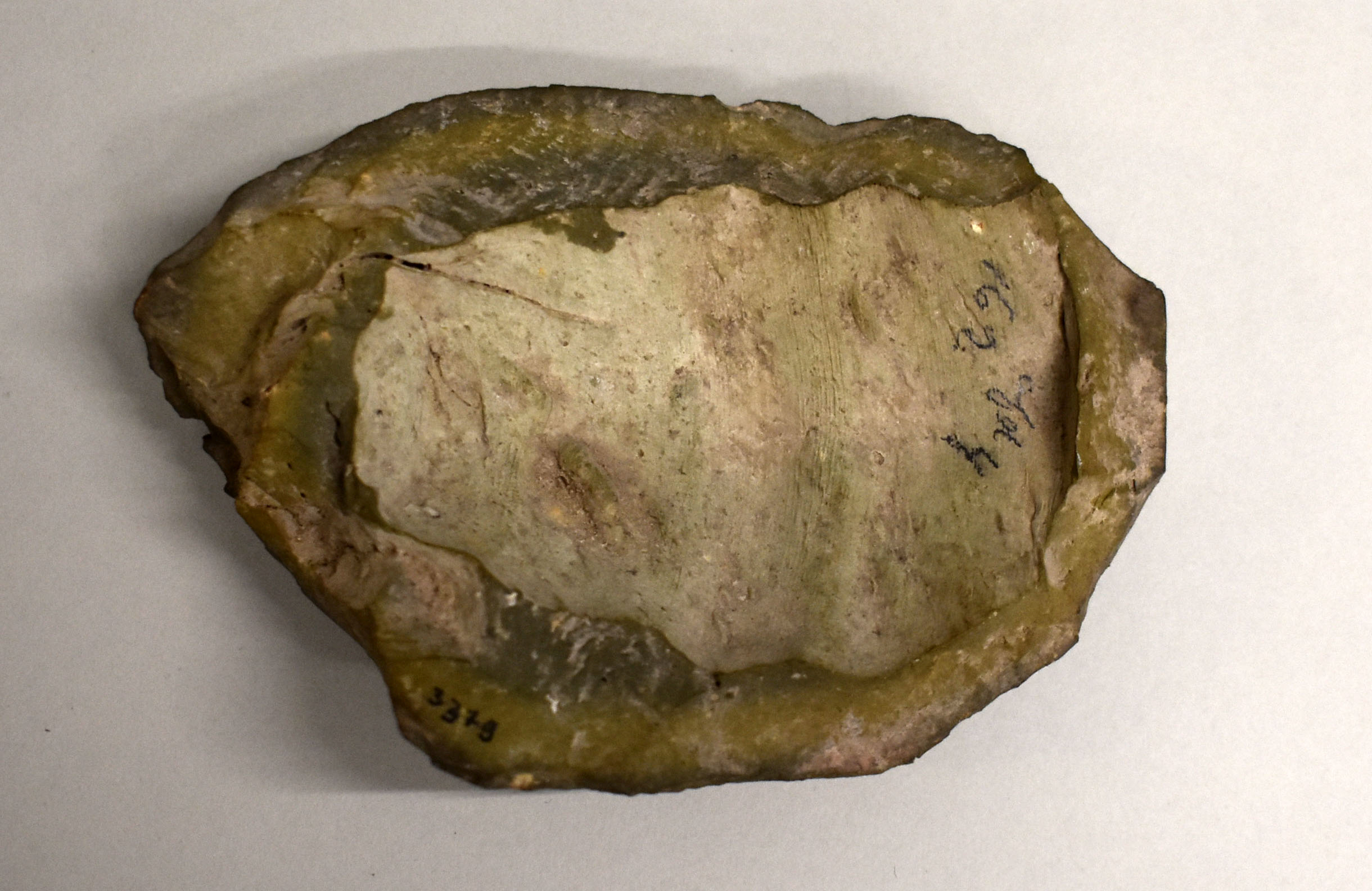 Groenachtig steenfragment met holle zijde, buitenkant met ruitmotief zoals een schild van een schildpad, met in één zijde duidelijk in reliëf een rad/spaakwiel. In de tegenover liggende zijde is vaag eenzelfde rad/spaakwiel te onderscheiden.
