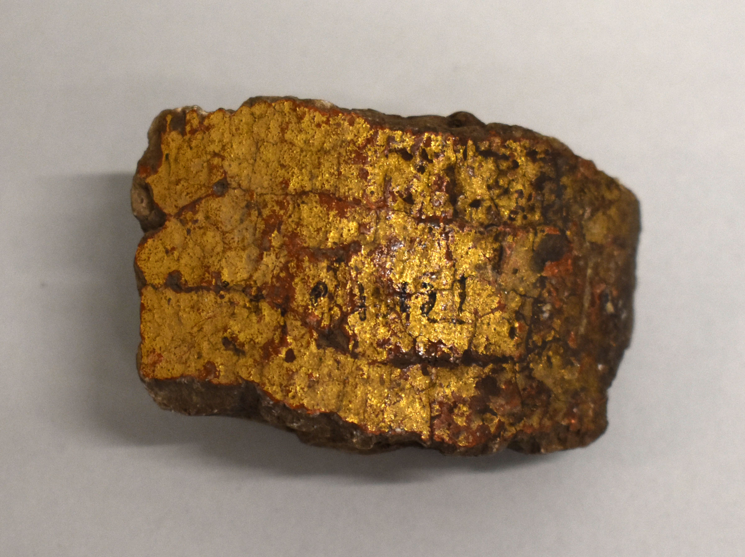 Fragment met gebogen goudkleurig oppervlak, afkomstig van de Tempel, opgegraven op de Tempelberg in Jeruzalem