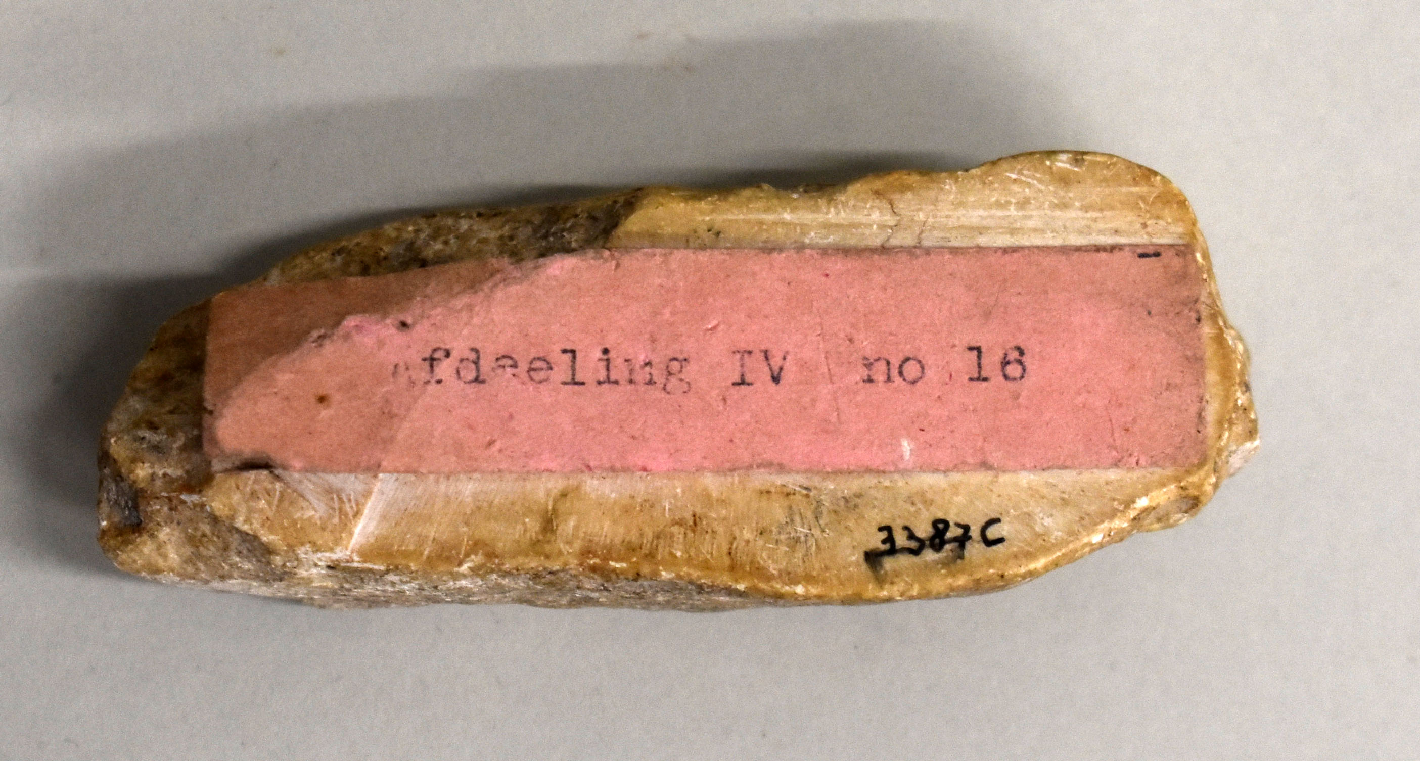 Steen, wellicht afkomstig van de Tempelberg. Eronder een papieren strookje met "Afdeeling IV no 18".