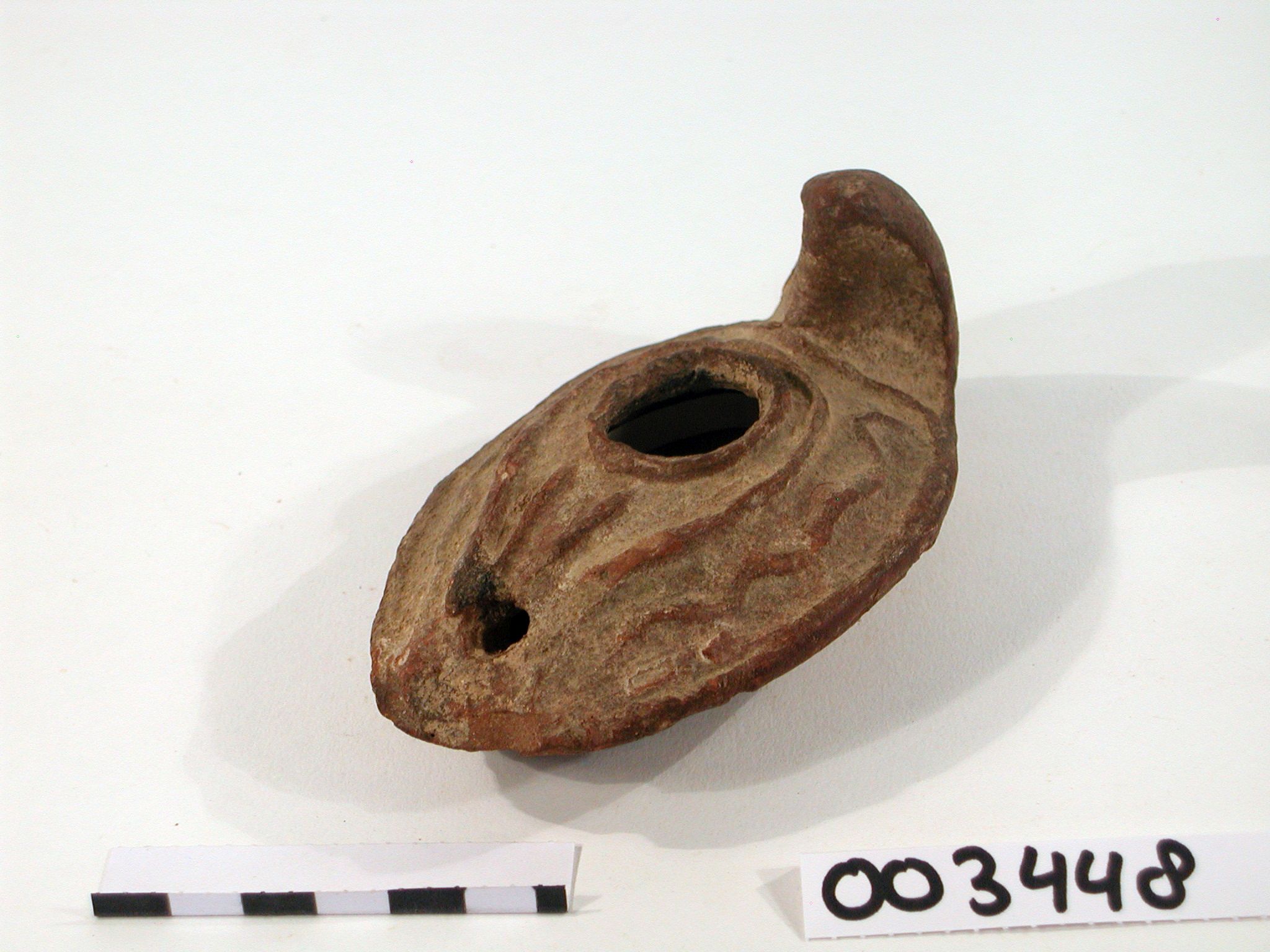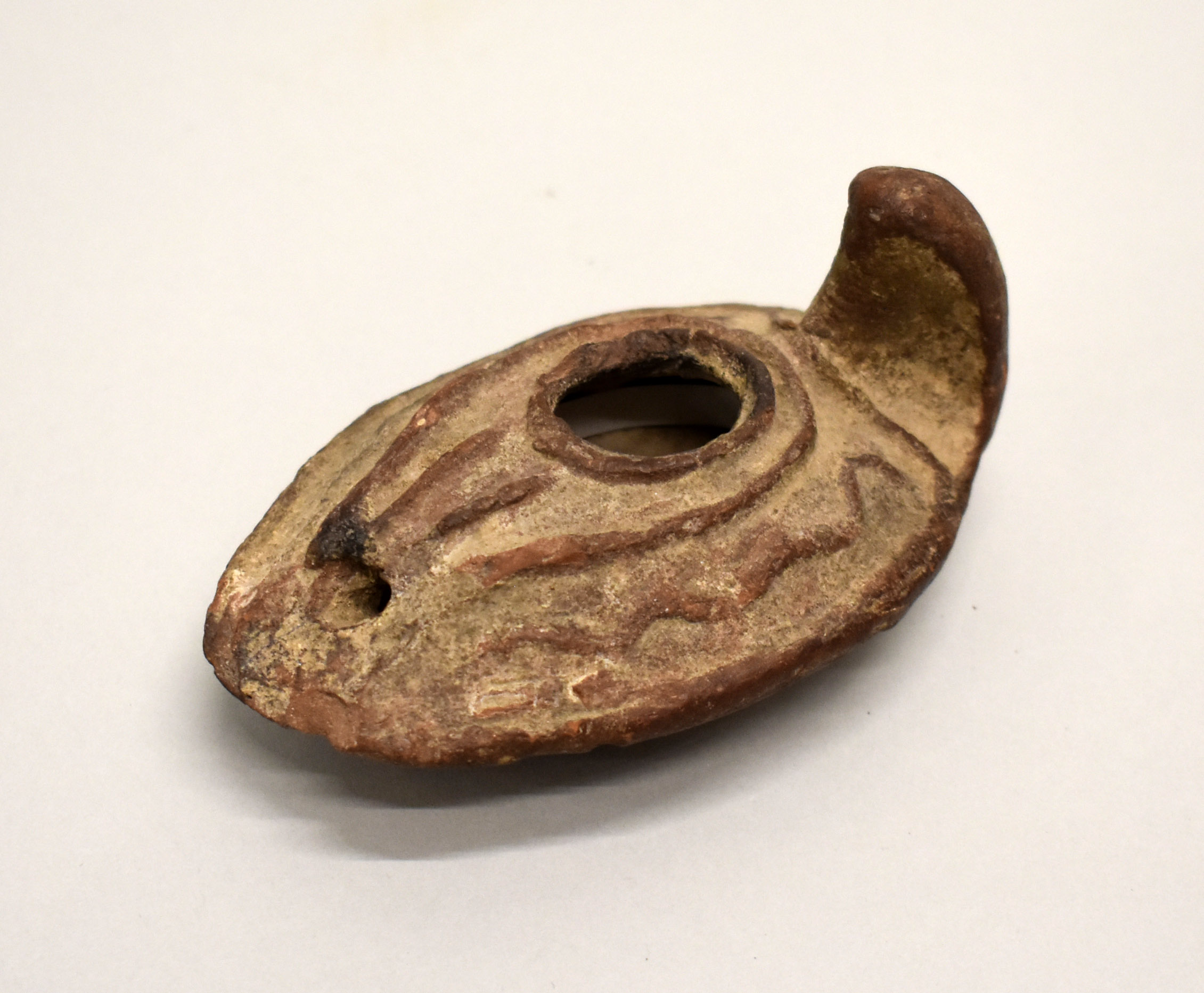 Olielamp met handvat, donkerbruin, gedecoreerd met slangenmotief in reliëf