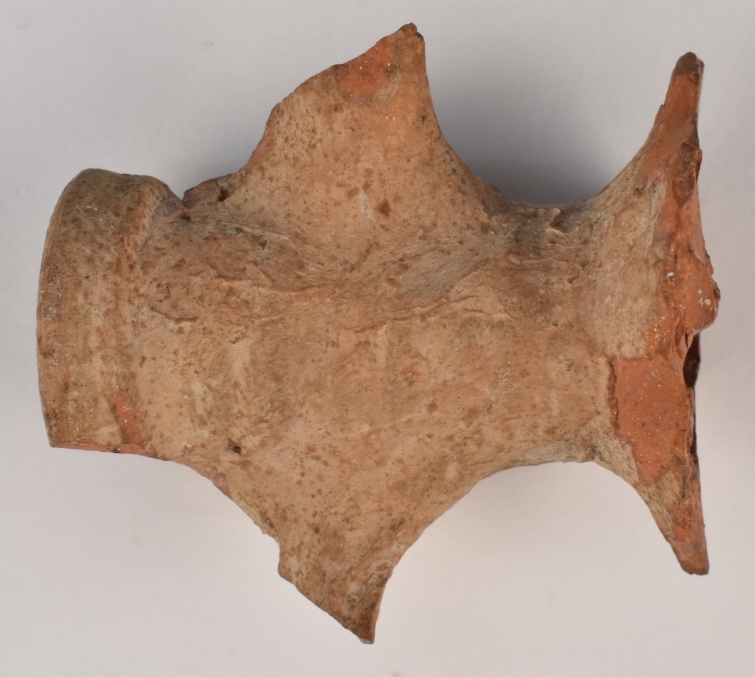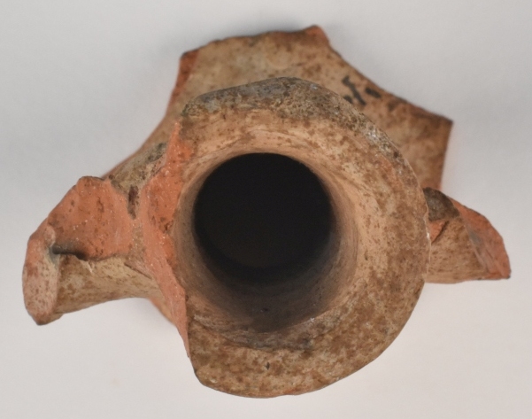 Scherf in rood aardewerk van een hals, met "30 fuß Christ Kirch", gevonden bij de Christuskerk op de berg Sion in Jeruzalem