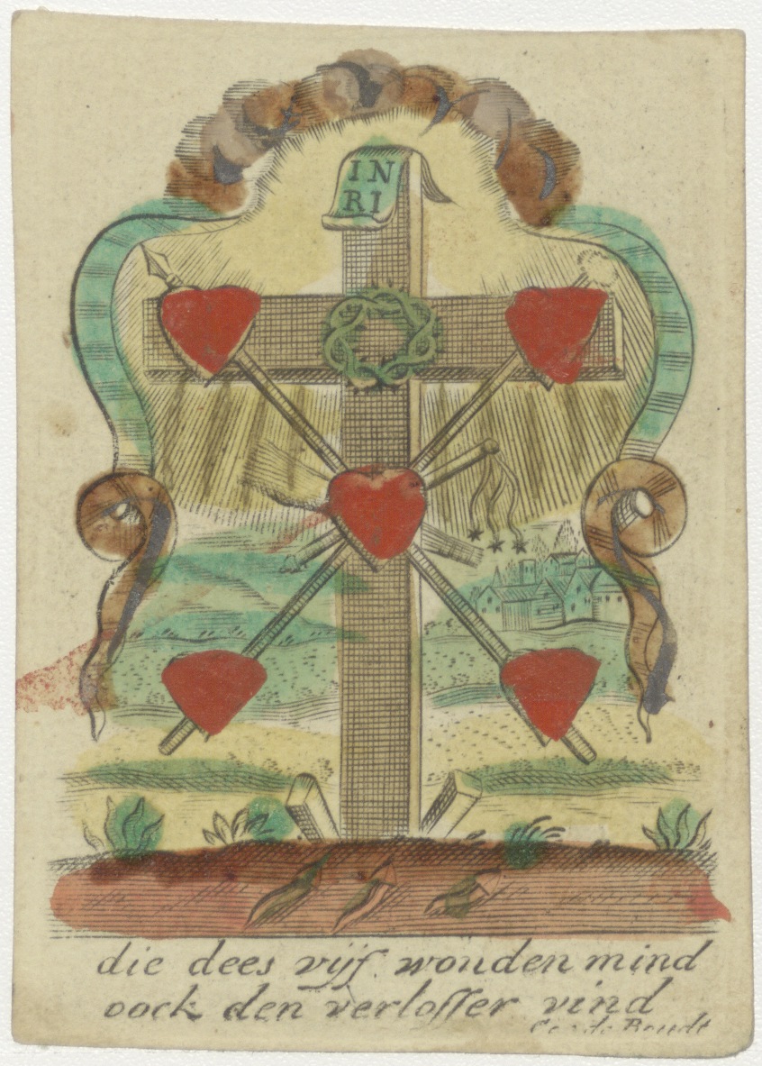 Kruis met lijdenswerktuigen en vijf harten als wonden, ingekleurd