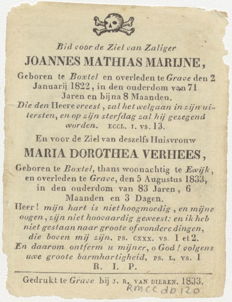 H. Hubertus, kz. Bid voor ziel Joannes Mathias Marijne (+1822);Grave en Maria Dorothea Verhees (+1833);Grave