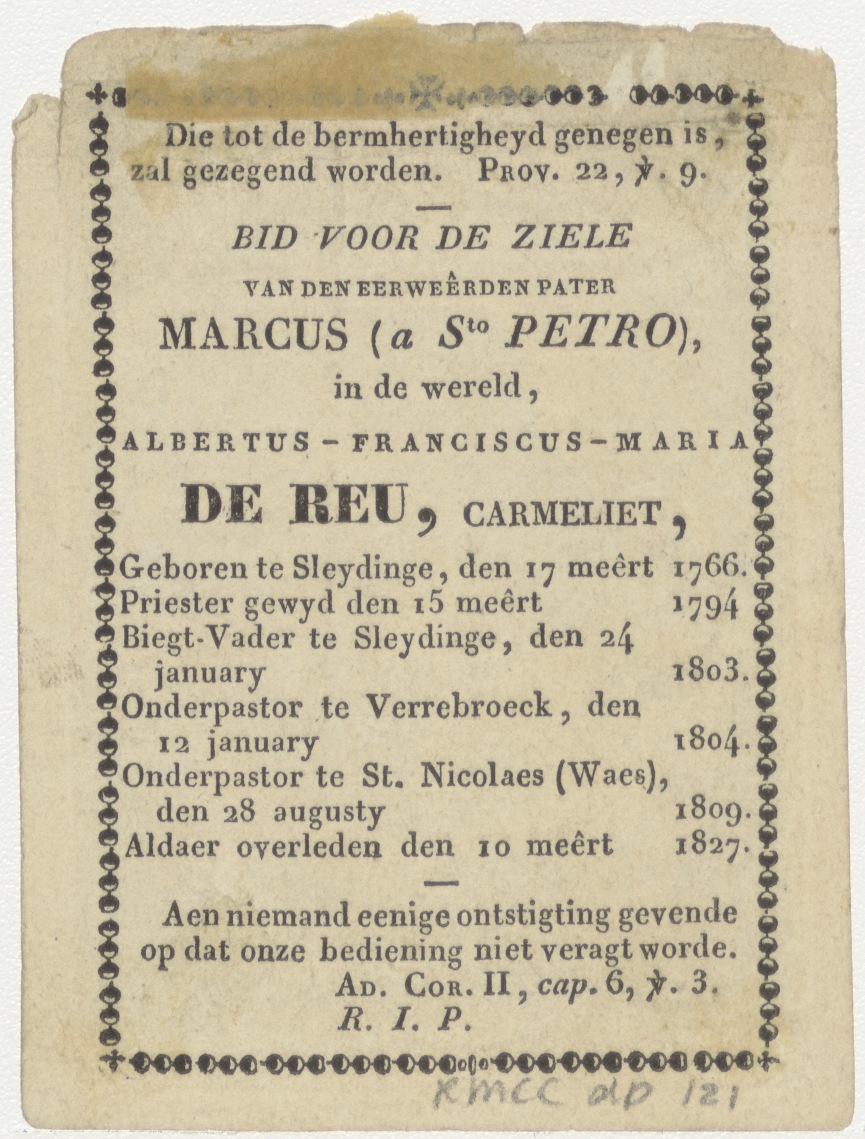 Jesus Christus, kz. Bid voor ziel Albertus Franciscus Maria de Reu, carmeliet (+1827);St. Nicolaes