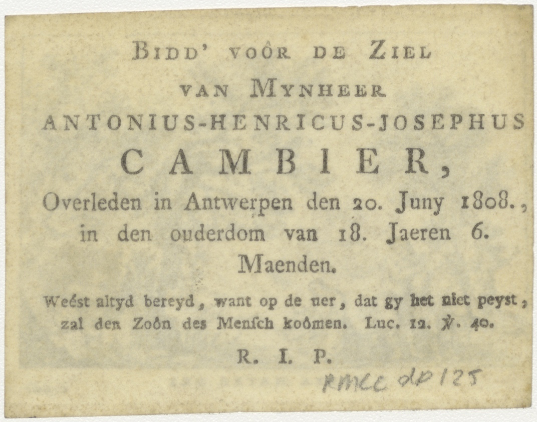 Rust op de vlucht naar Egypte, kz. Bid voor ziel Antonius Henricus Josephus Cambier (+1808);Antwerpen