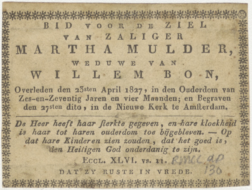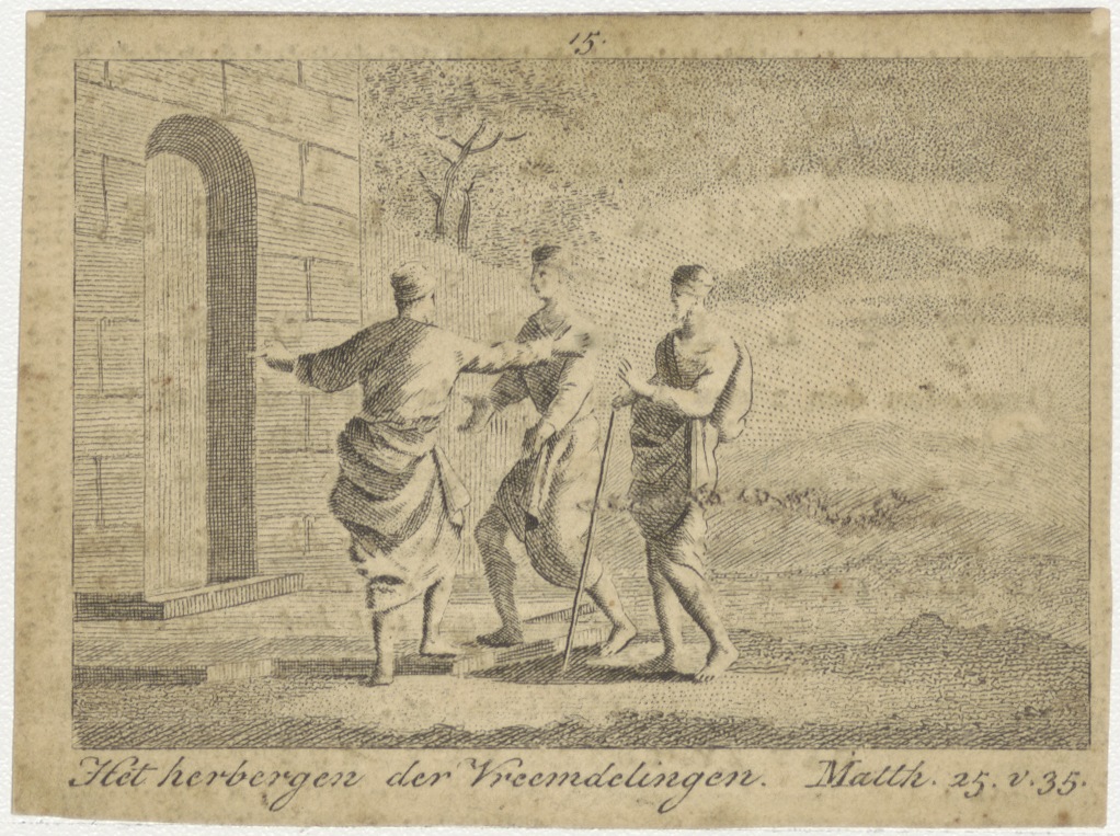 Het herbergen der vreemdelingen (Mat.25:35), kz. Bid voor ziel Martha Mulder (+1827);Amsterdam