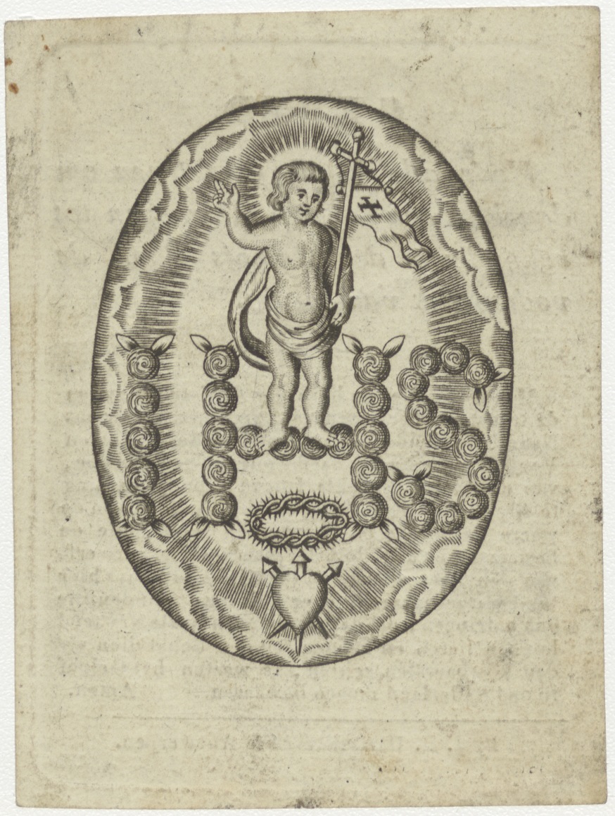 Christuskind staande op monogram IHS, kz. drukwerk, gebed
