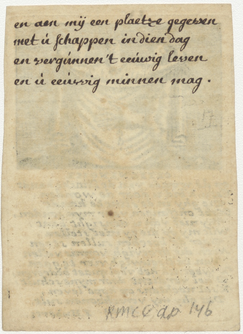 Engel met doek waarop Christus' doorboorde linkerhand is afgebeeld, met gebed