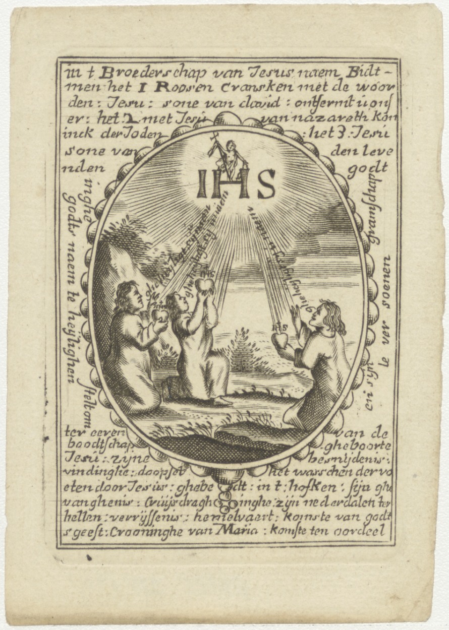 Drie geknielde biddende mensen met tekst "in t broederschap van Jesus naem, bidt men ..."