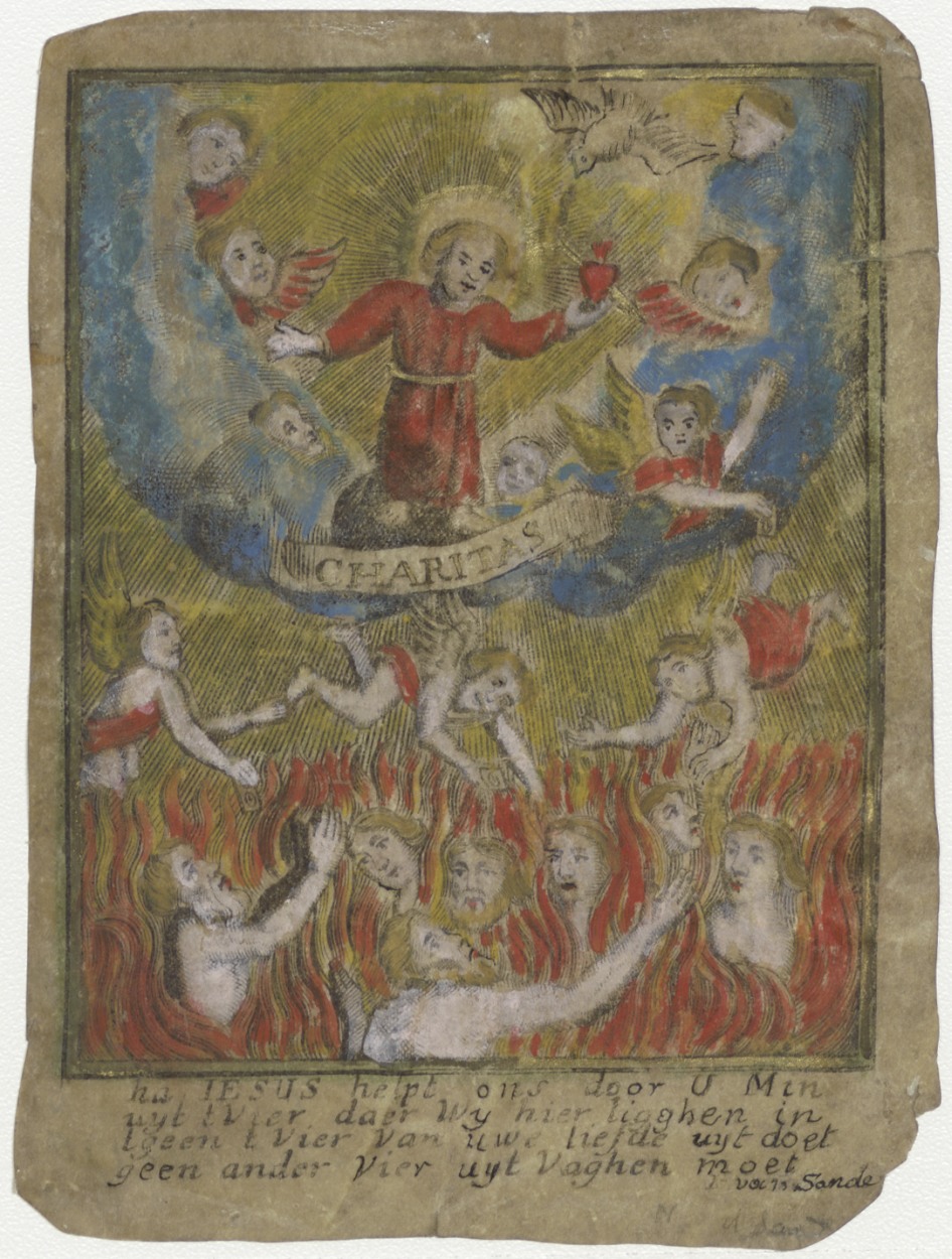 Christuskind met engelen boven het vagevuur, ingekleurd