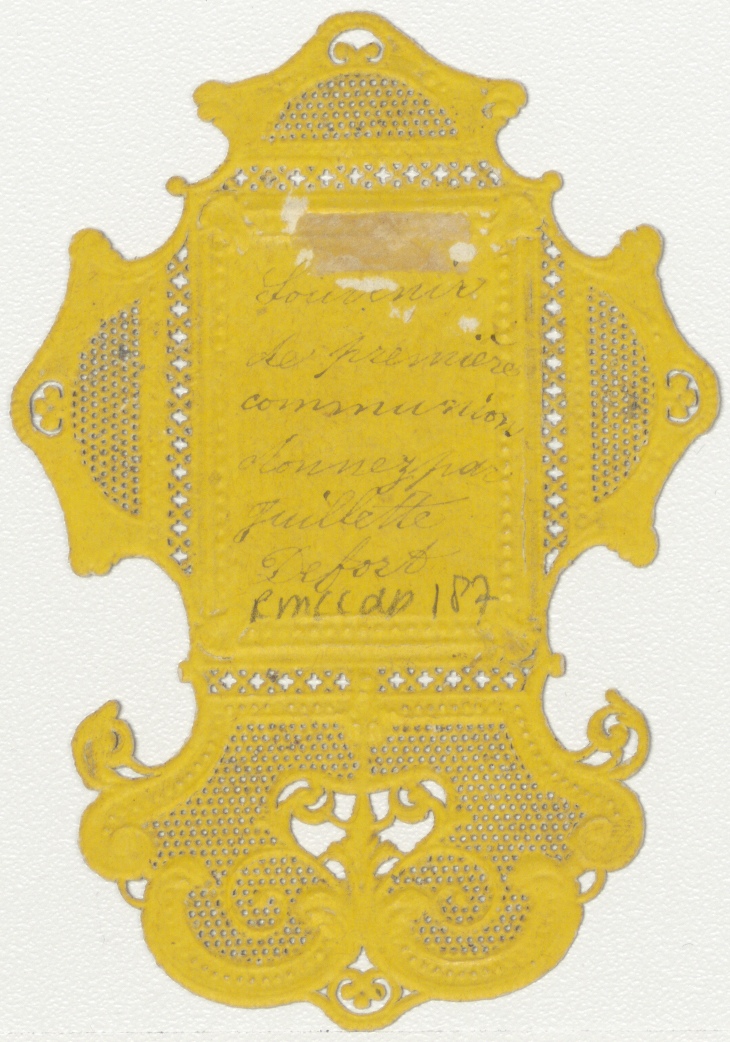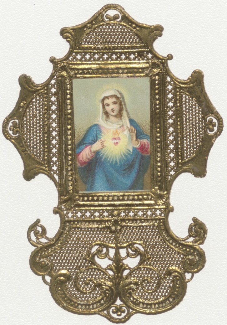 Maria met H. Hart, kz. Opschrift "Souvernir de première communion donnez par Juillette Defort"