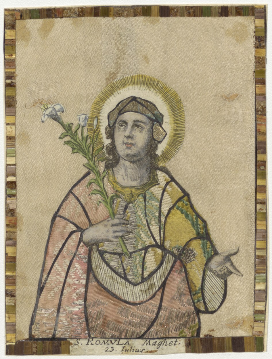 H. Romula, maagd, met geappliceerd borduurwerk en strorand, ingekleurd