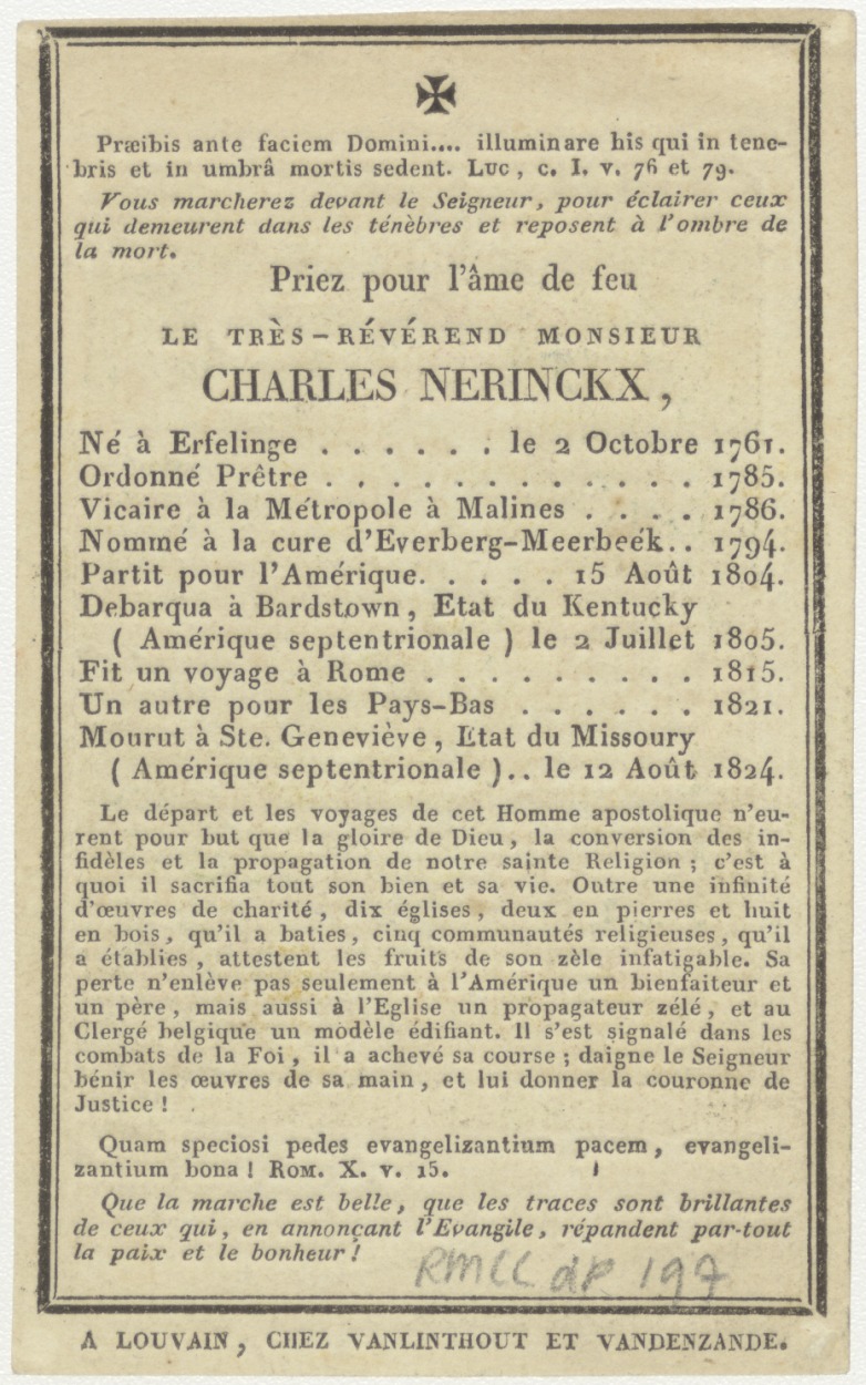 H. Agatha, ingekleurd, kz. Frans; Bid voor ziel eerwaarde heer Charles Nerinckx (+1824);Ste. Geneviève
