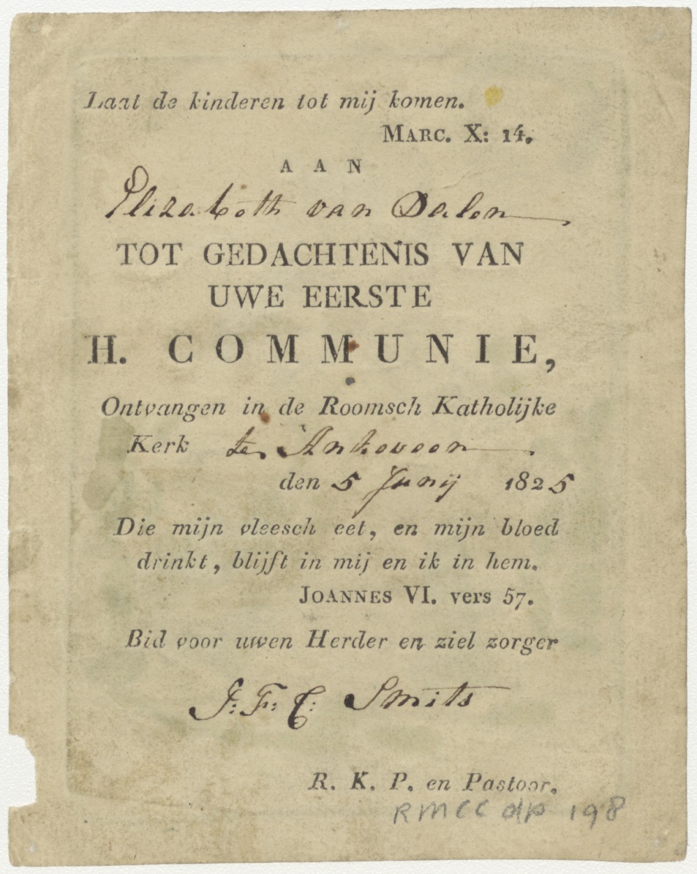 H. Elisabeth, ingekleurd, kz. H. Communie Elizabeth van Dalen;1825;R.K. kerk te Ankeveen