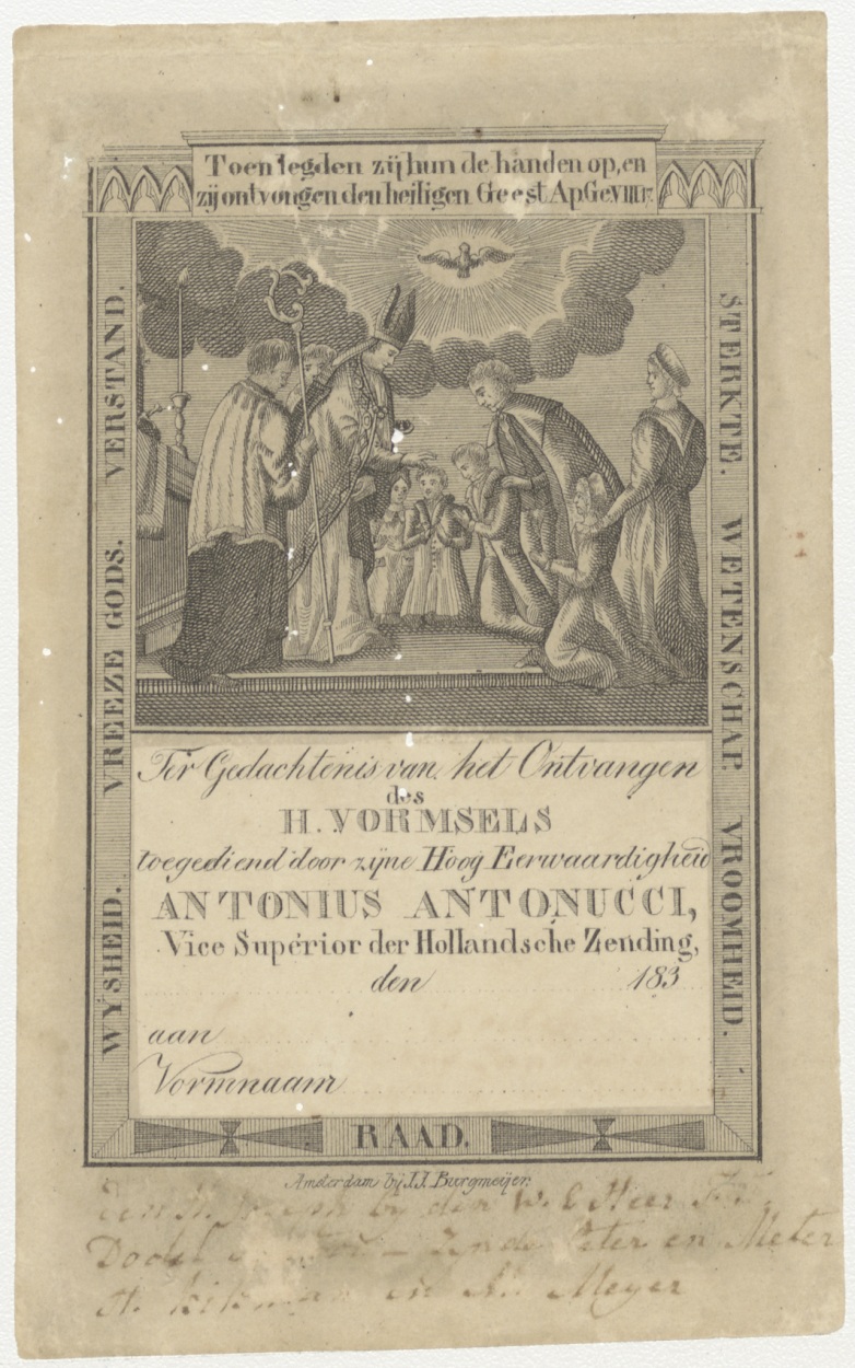 Vormselprent t.g.v. vormsel door Antonius Antonucci, vice-superior der Hollandsche Zending