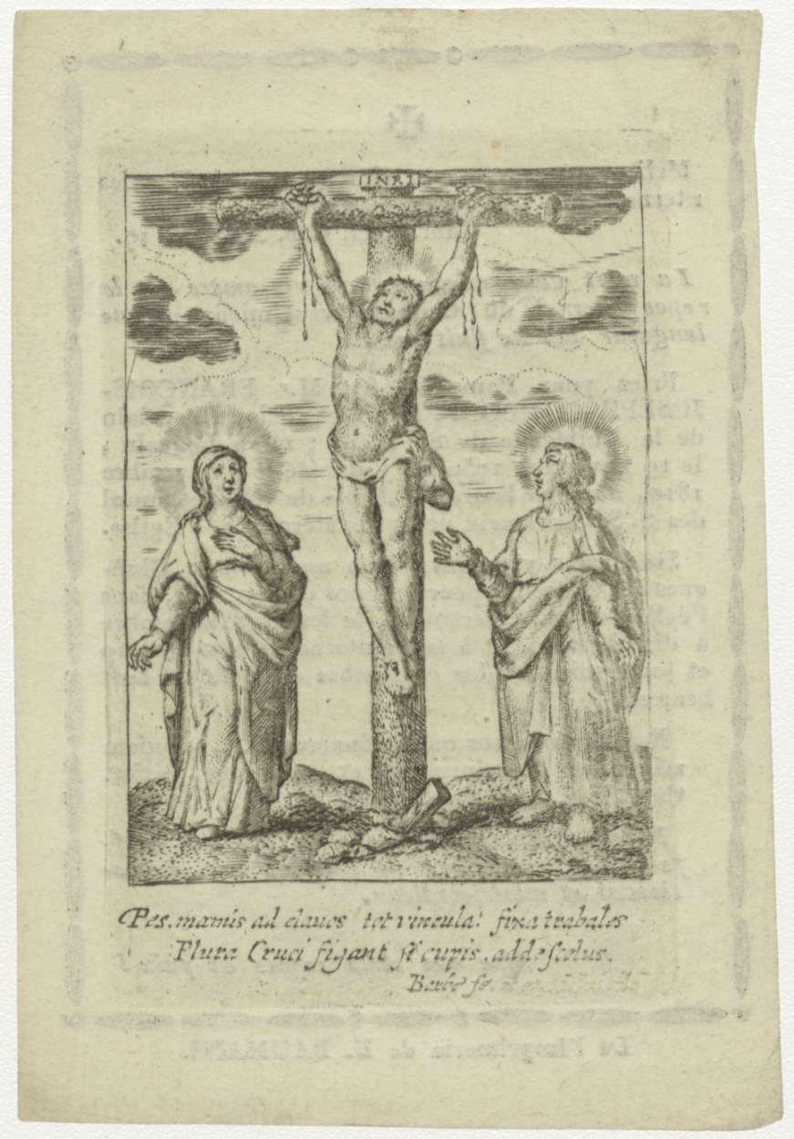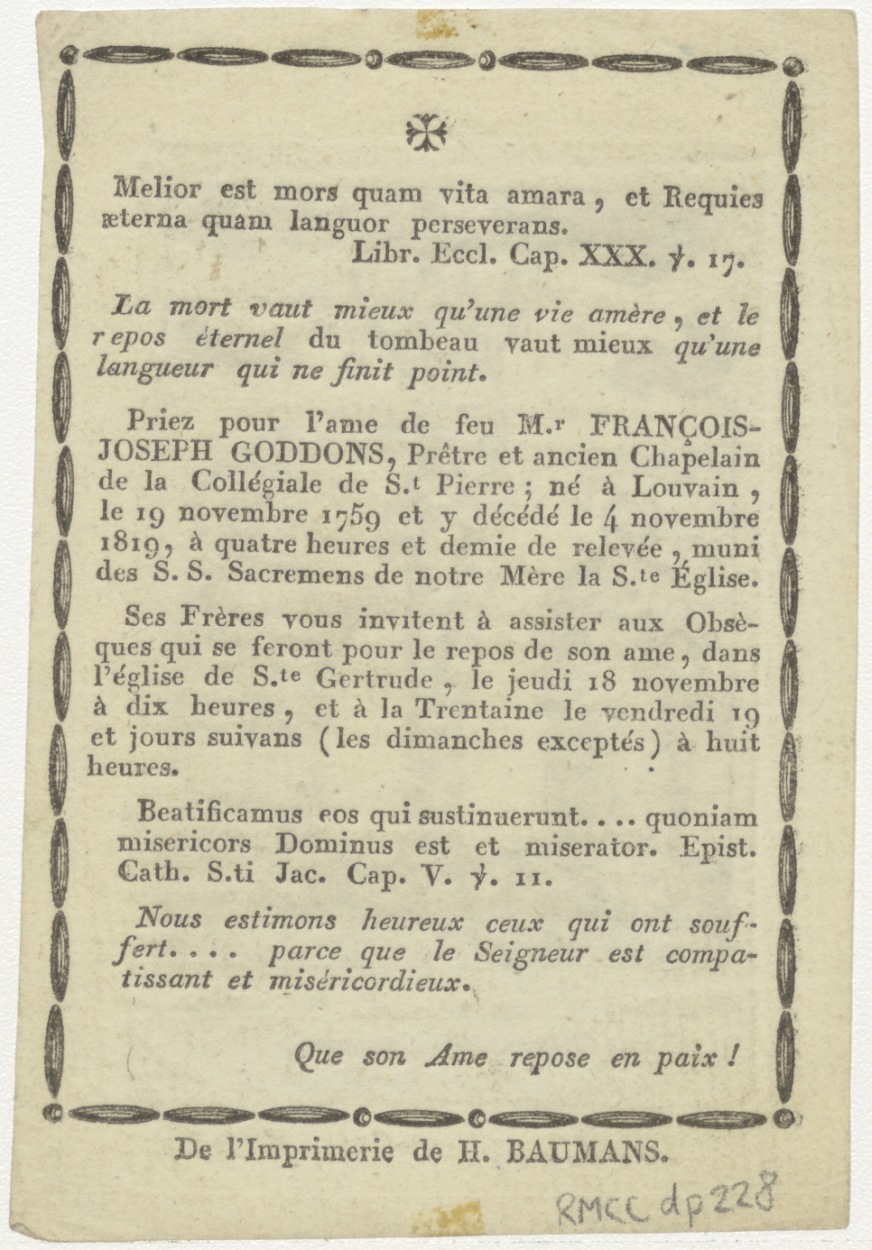 Gekruisigde Christus met Maria en Johannes, kz. Religieus; bid voor ziel François-Joseph Goddons (+1819) Leuven, priester