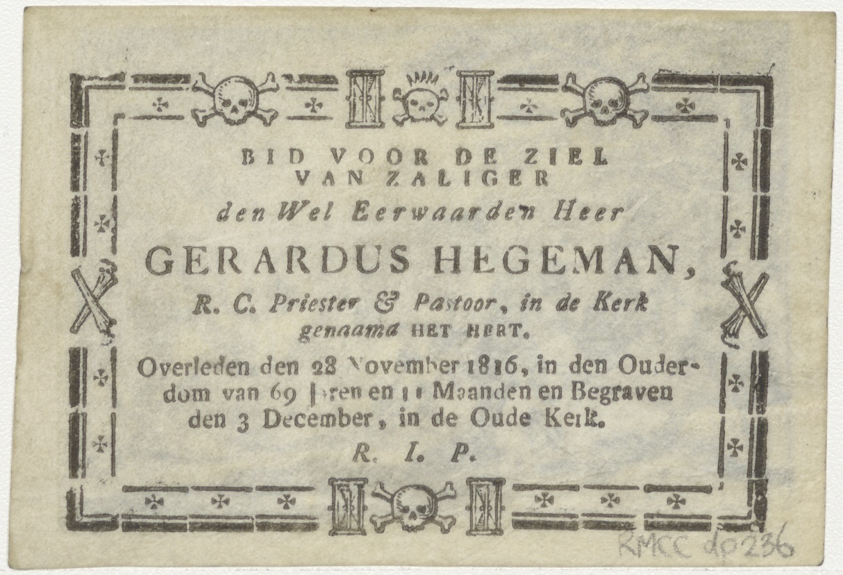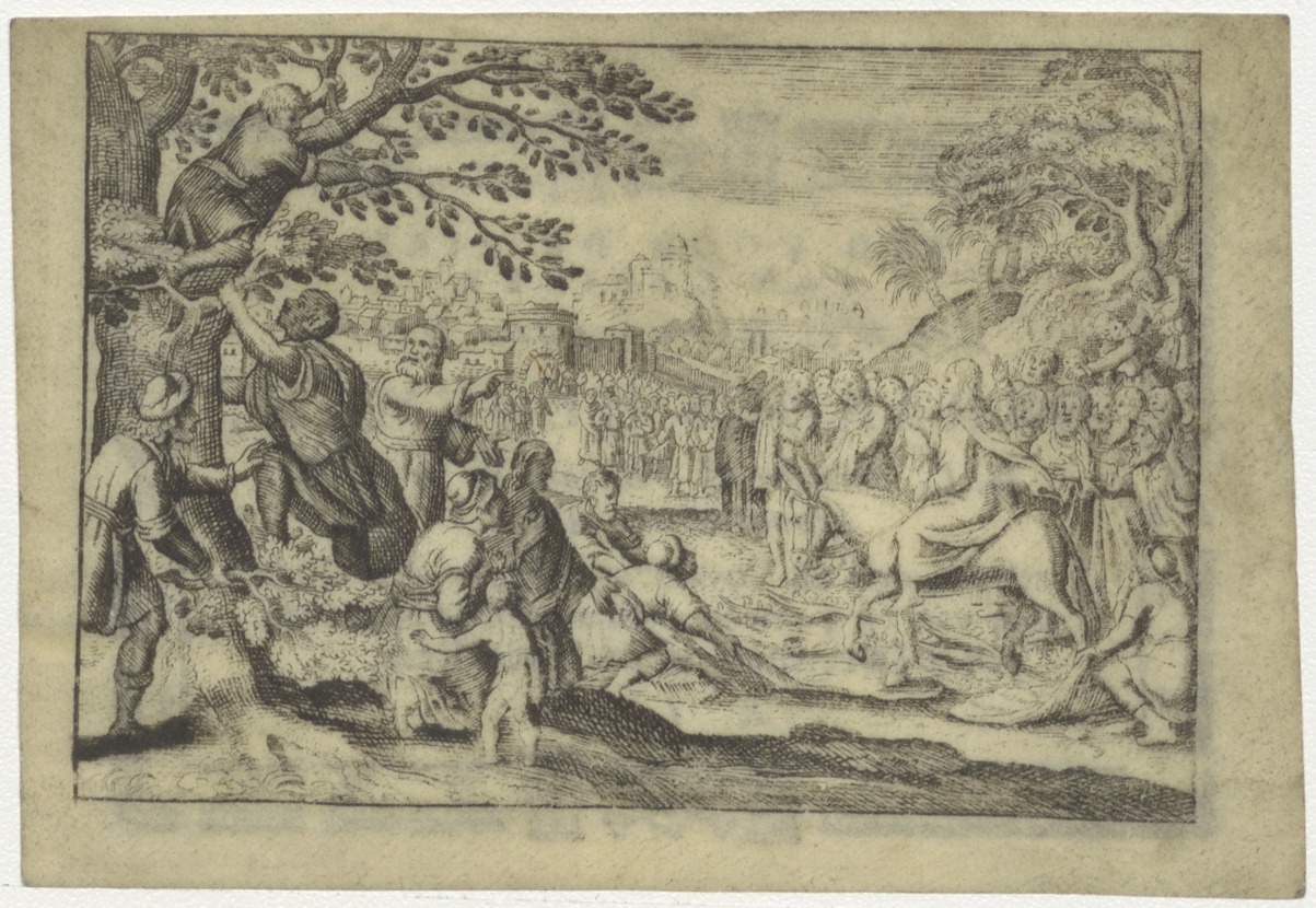 Intocht van Christus in Jeruzalem, kz. Religieus;Bid voor ziel Gerardus Hegeman (+1816), pastoor de kerk het Hert, Amsterdam(?)