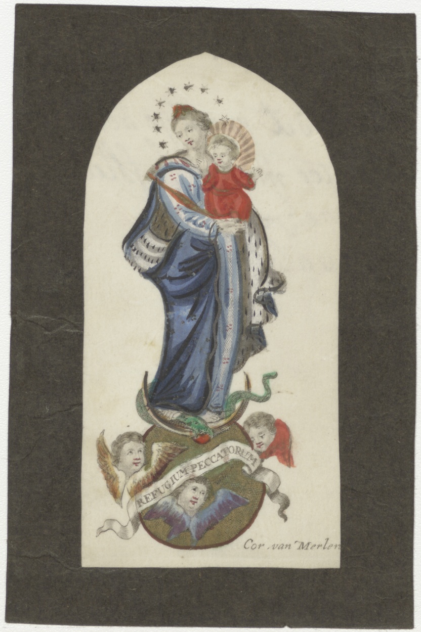 Maria met kind staande op maansikkel met slang, ingekleurd, met zwarte passe-partout, kz. Dit printije hoort toe Maria Hofstee gekreege van pater Saamen