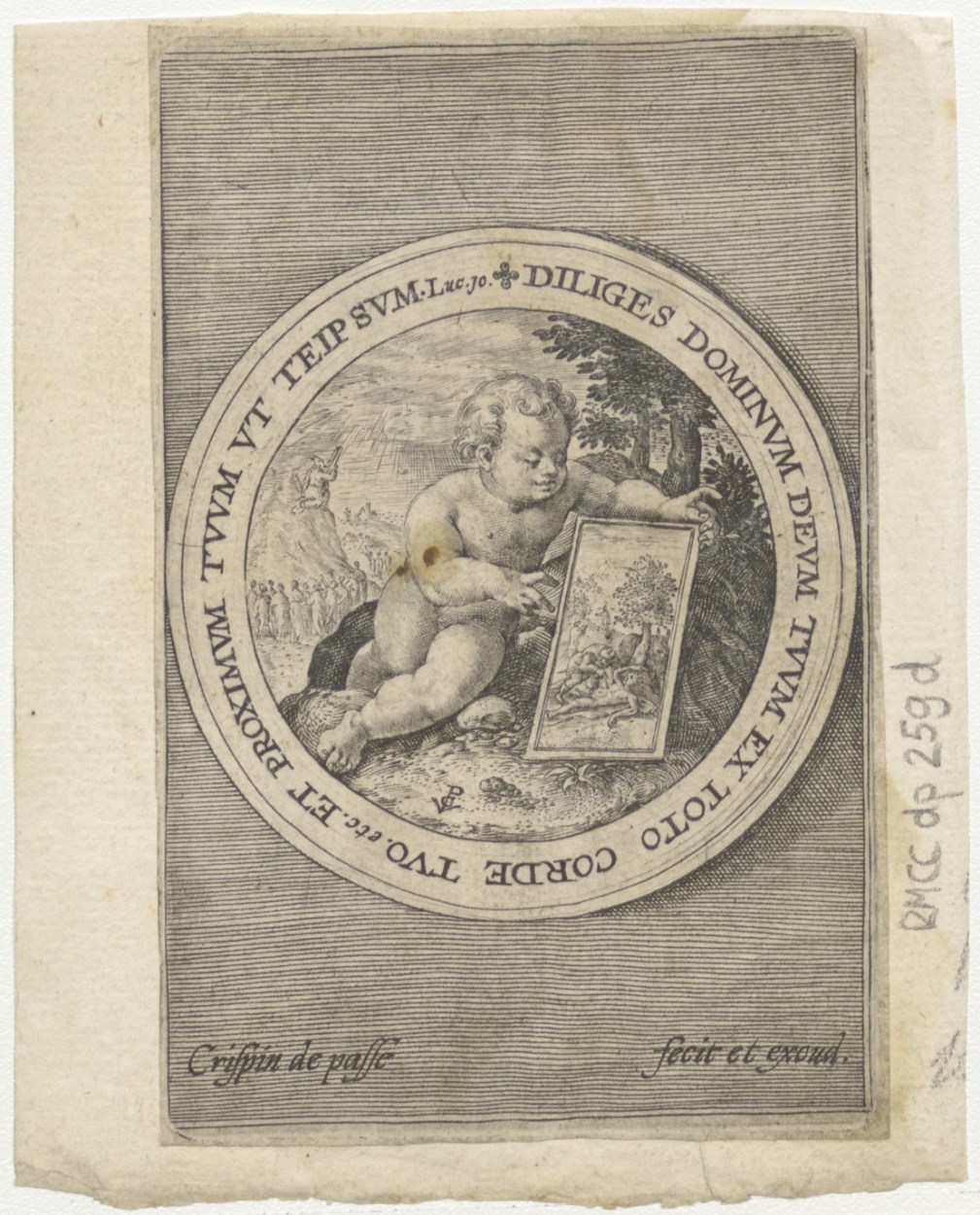 Putti die Gods woord verbeelden (serie): Putto toont voorstelling van de barmhartige Samaritaan, met "Dilliges dominum deum tuum ex toto corde tuo ..."