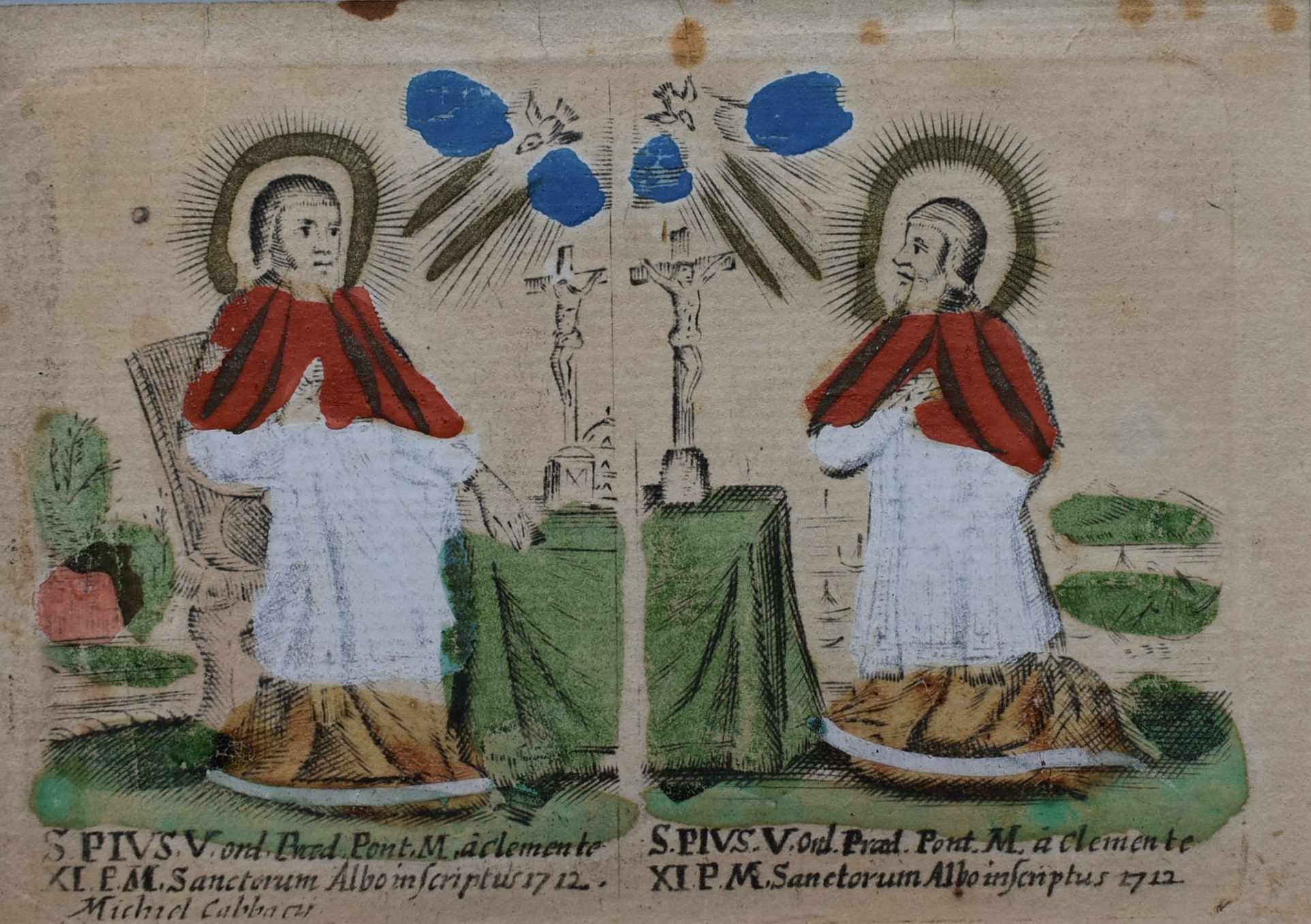 Heilige paus Pius V bij kruisbeeld (tweemaal), ingekleurd. Volksprent met twee voorstellingen op één niet versneden blad.