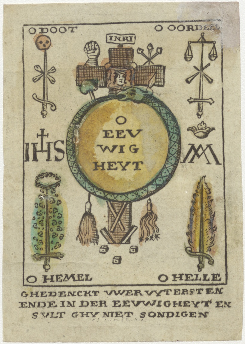 Vier Uitersten met een passiekruis en "Ghedenckt uwer uytersten ende in der eeuwigheyt en sult ghy niet sondigen", ingekleurd