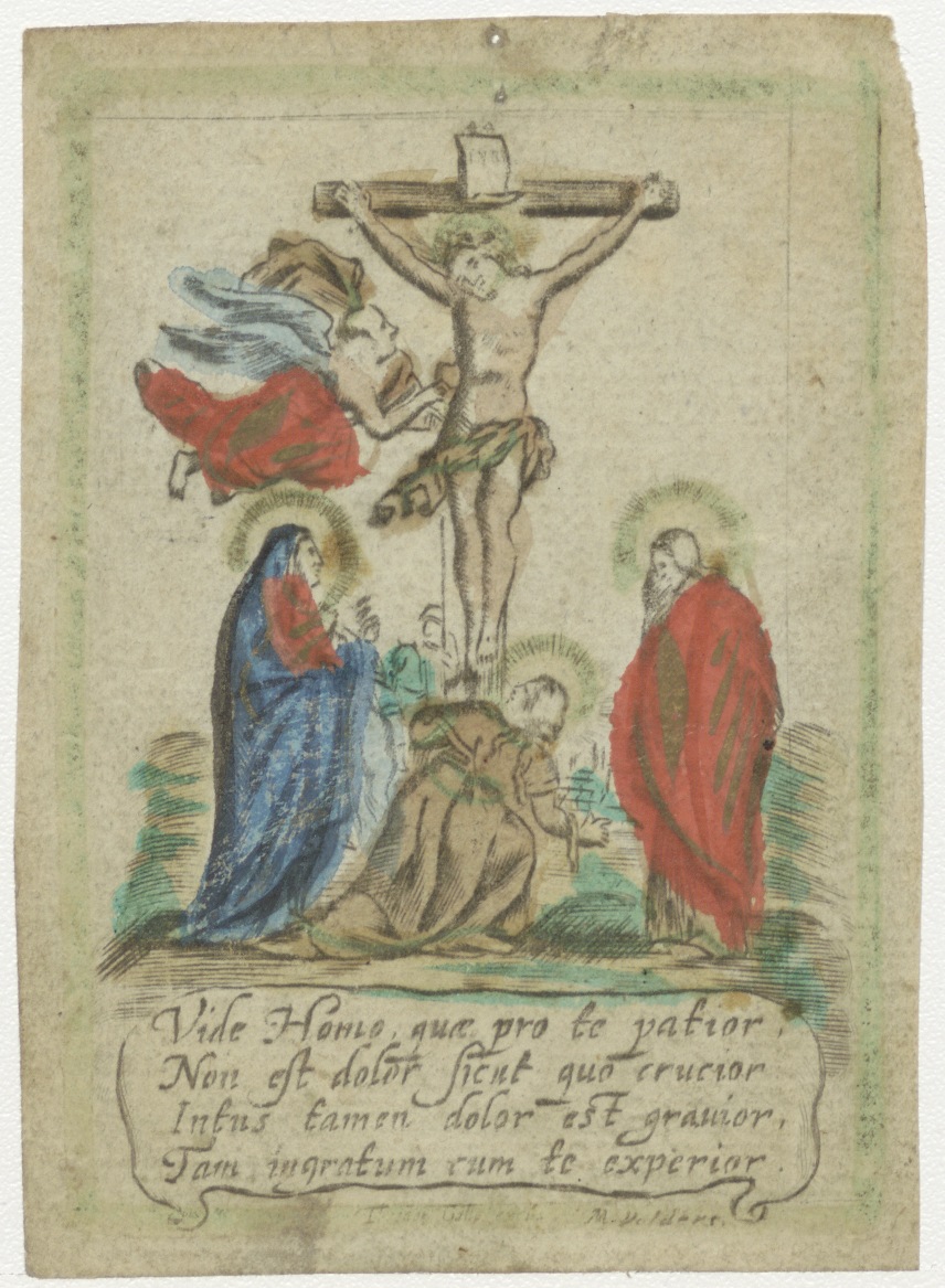 Christus aan het kruis met Maria, Johannes en Maria Magdalena, ingekleurd