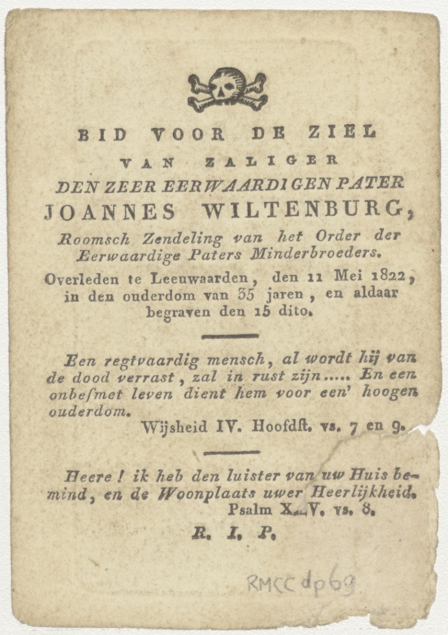 Ten hemelopneming van Maria, kz. religieus;bid voor ziel pater Joannes Wiltenburg (+1822), zendeling van het order der Minderbroeders;Leeuwarden