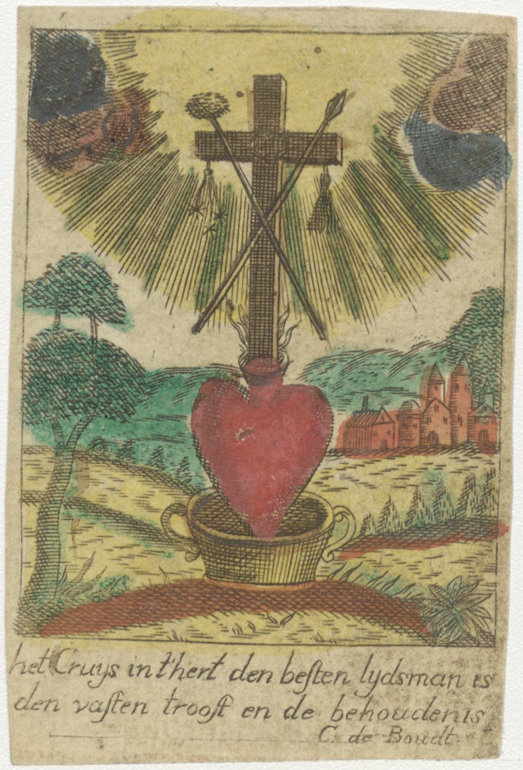 Kruis met lijdenswerktuigen op H. Hart, ingekleurd