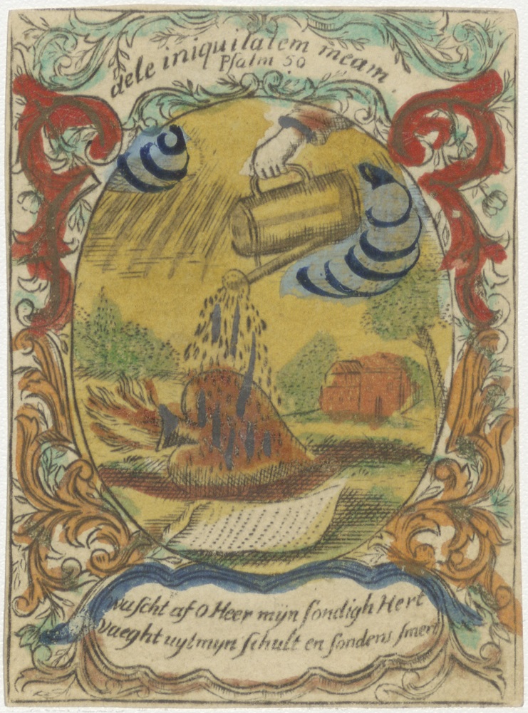 Brandend hart (ziel) wordt begoten door hand met gieter uit de hemel, ingekleurd