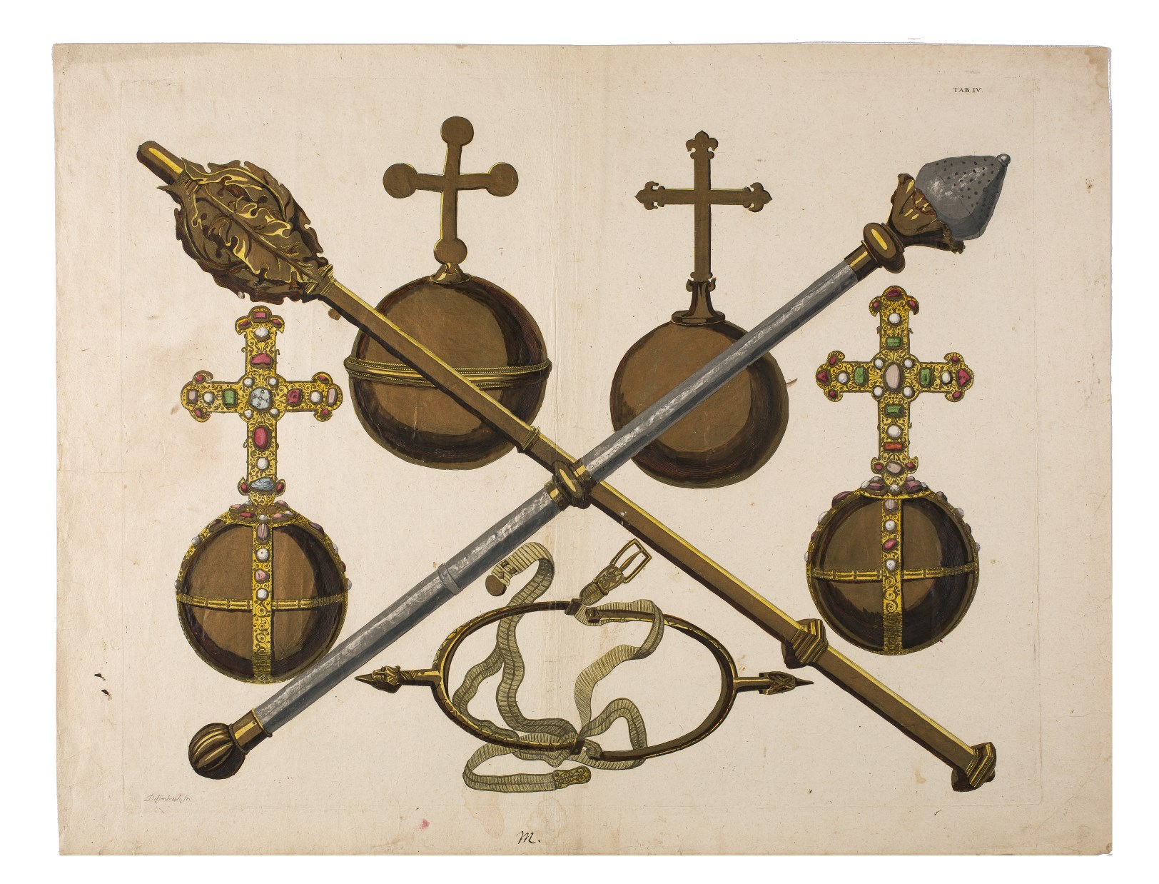Aachner Reichsreliquien (serie): scepter en gekroonde wereldbollen (rijksappels) ingekleurd