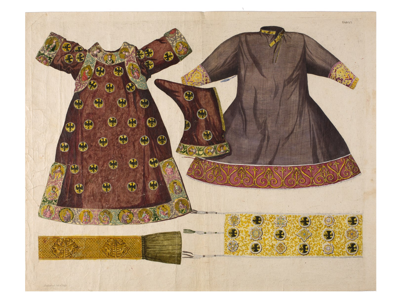 Aachner Reichsreliquien (serie): dalmatiek met muts en tunica (keizer Roger 1133) manipel en stola