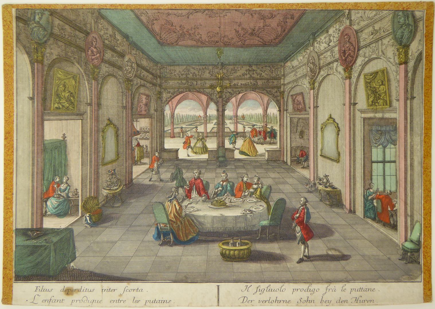 Verloren zoon, serie opticaprenten (ingekleurd): de zoon bij de hoeren