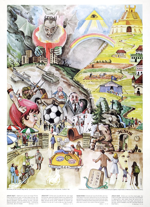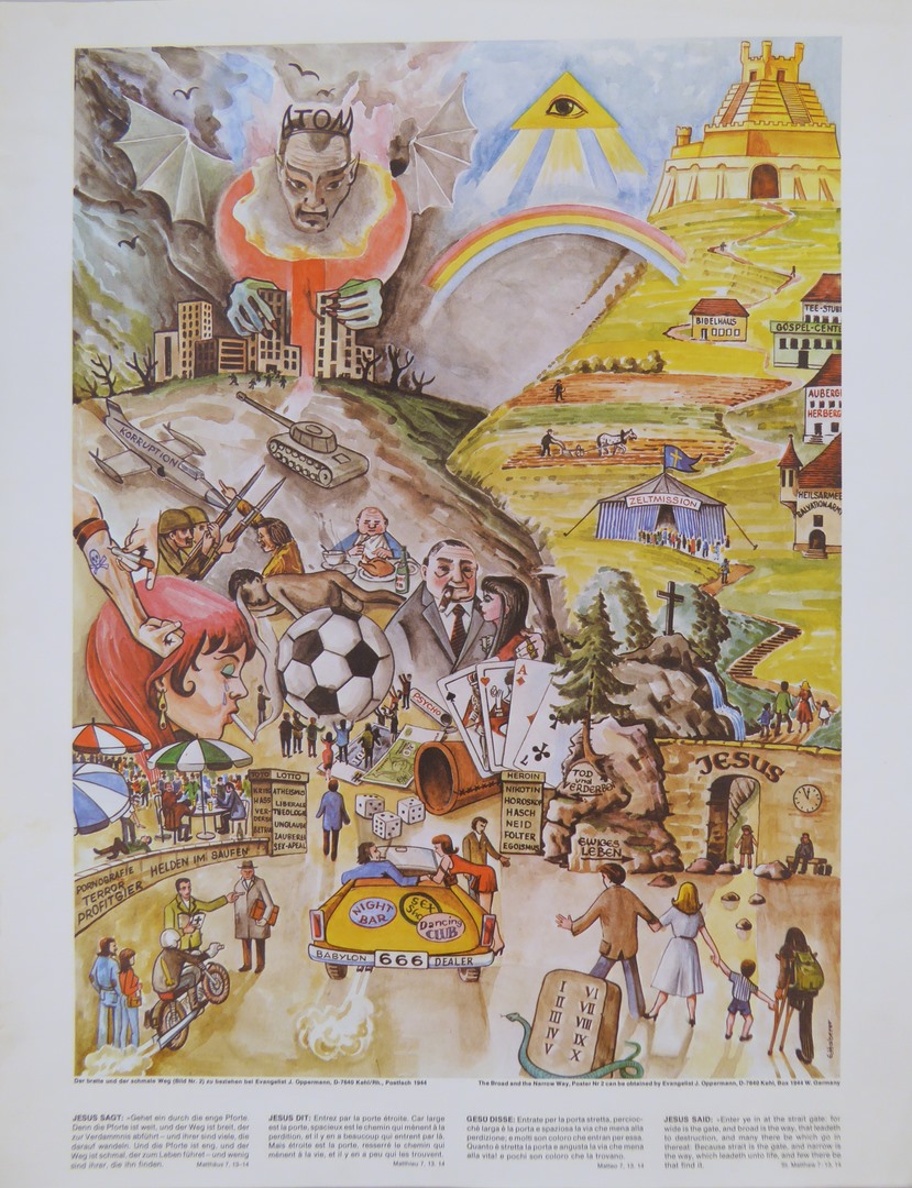 Voorstelling met brede en smalle weg, kansspelen, tanks, gevechtsvliegtuig, duivel Atom