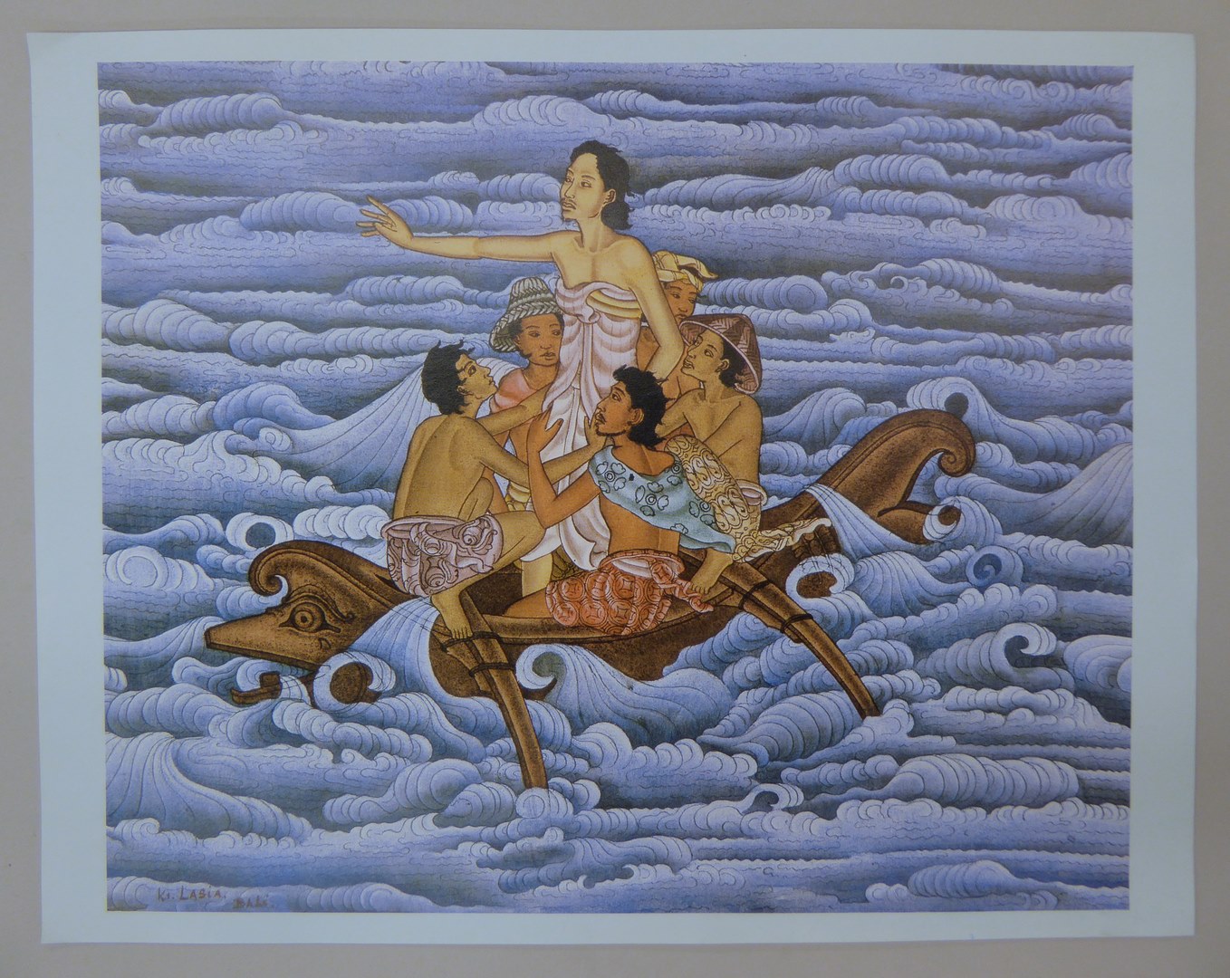 Christus stilt de storm, Christus en apostelen in een bootje op zee, Indonesisch uitziende figuren en kledij