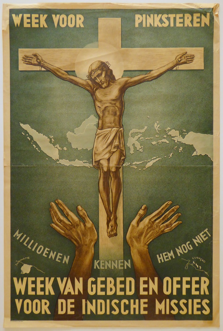 Affiche met crucifix, met "Week voor pinksteren millioenen kennen hem nog niet .. Indische missies"