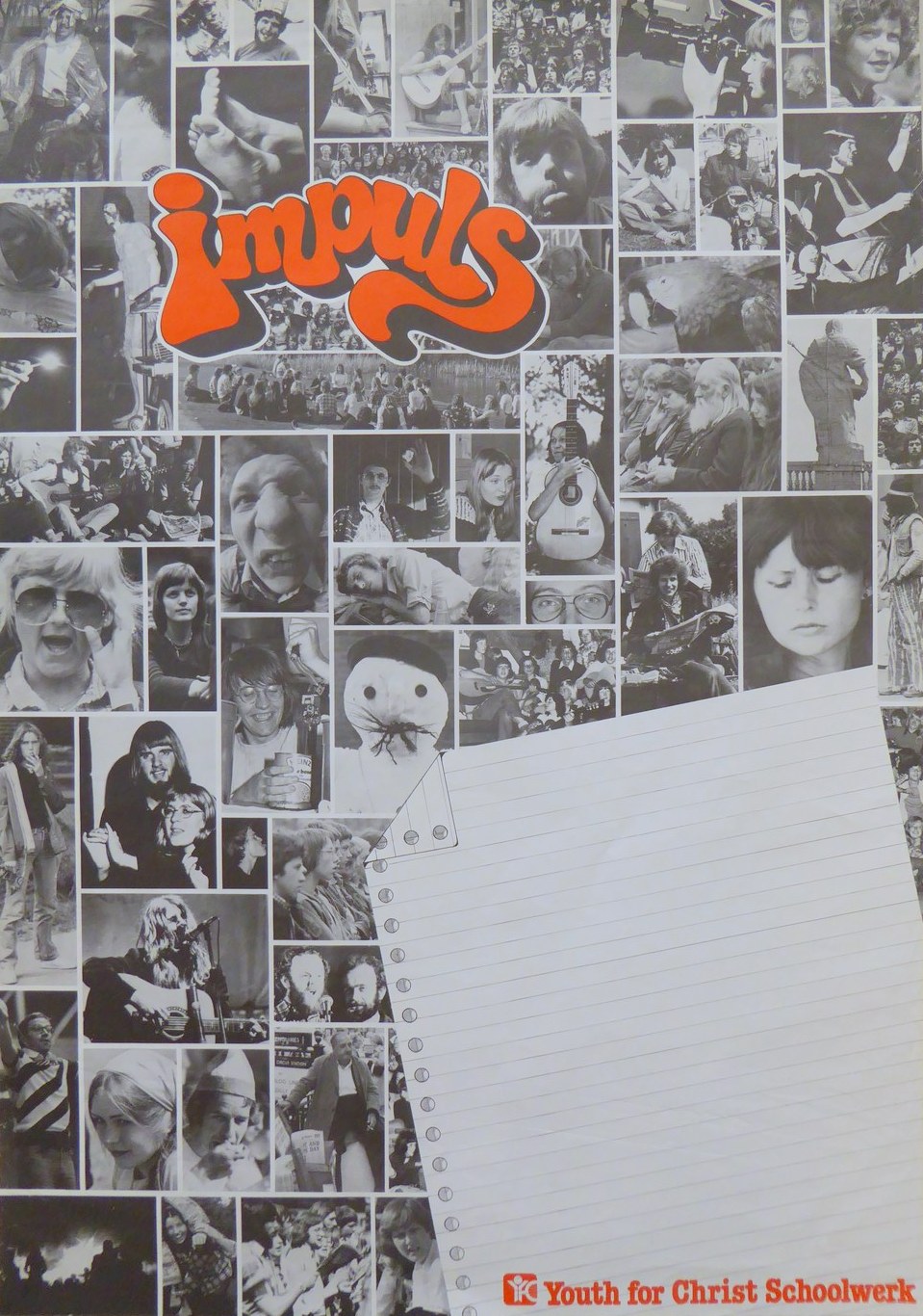 Affiche "Impuls", "Youth for Christ schoolwerk" met veel foto's van jongeren