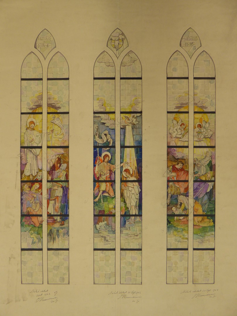 Ontwerp drie ramen met Christus en de aartsvaders, doop van Christus en kindermoord