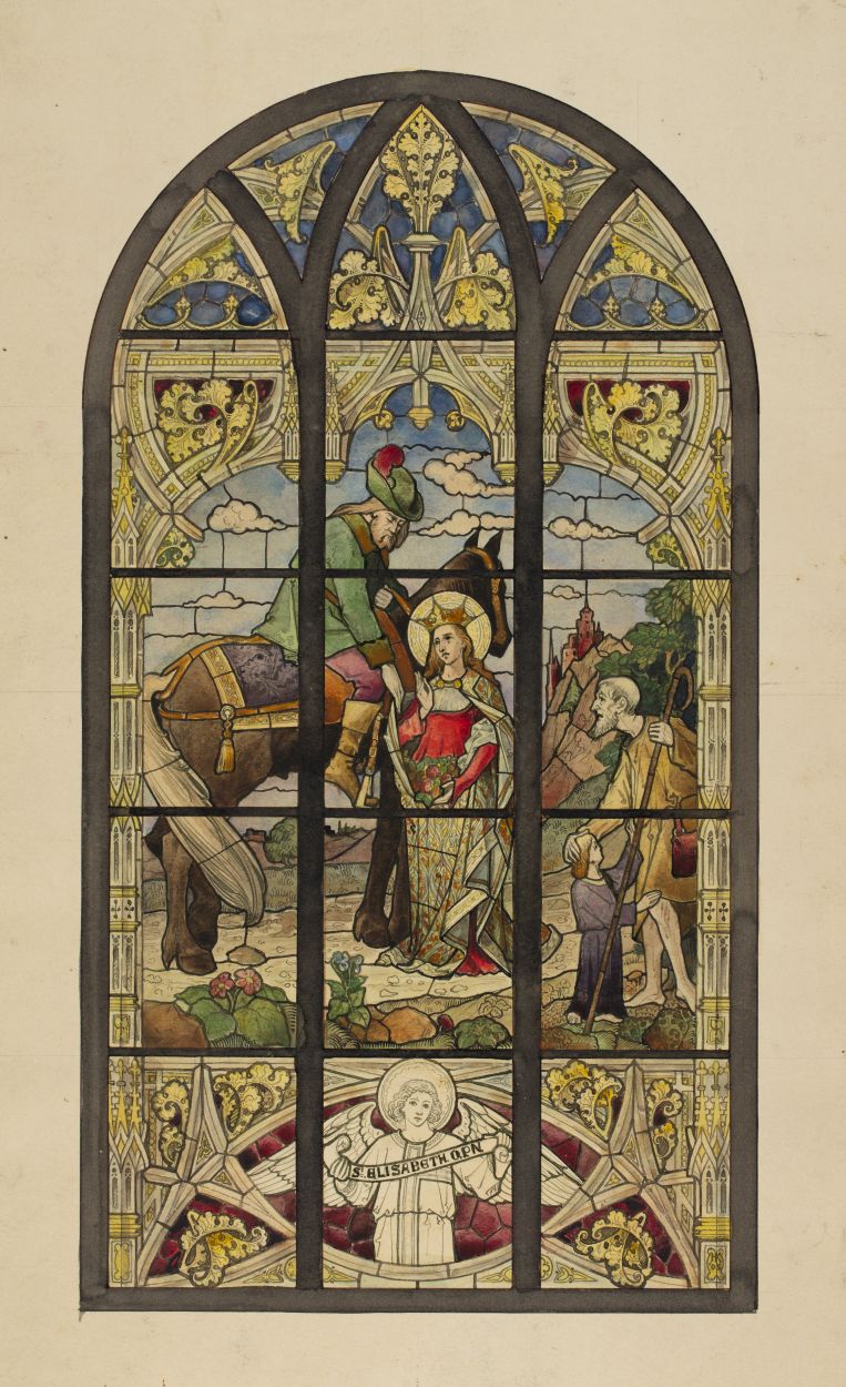 Ontwerp glasraam met St. Elisabeth en ruiter