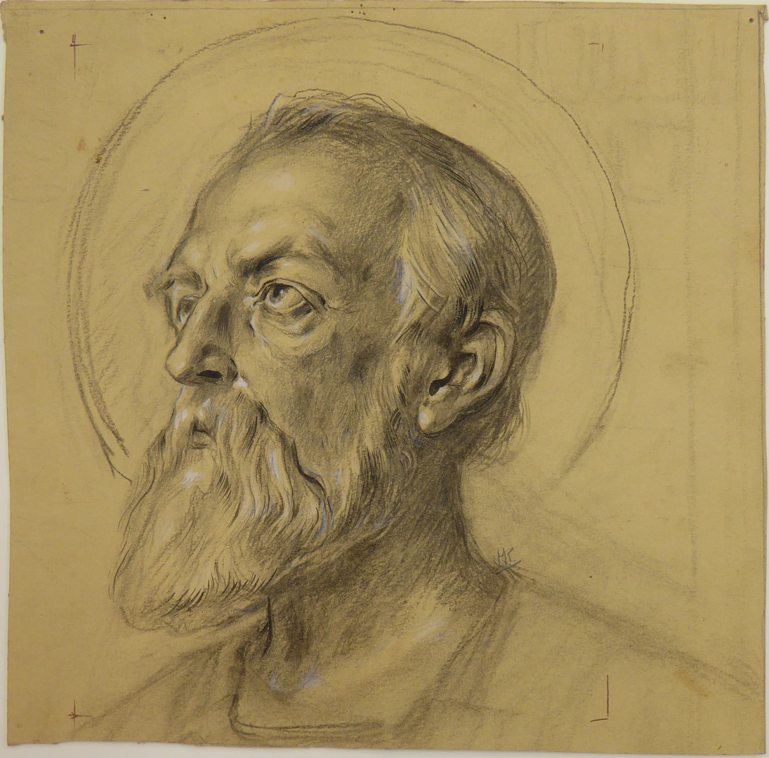 Ontwerp glasraam met portret mannelijke heilige