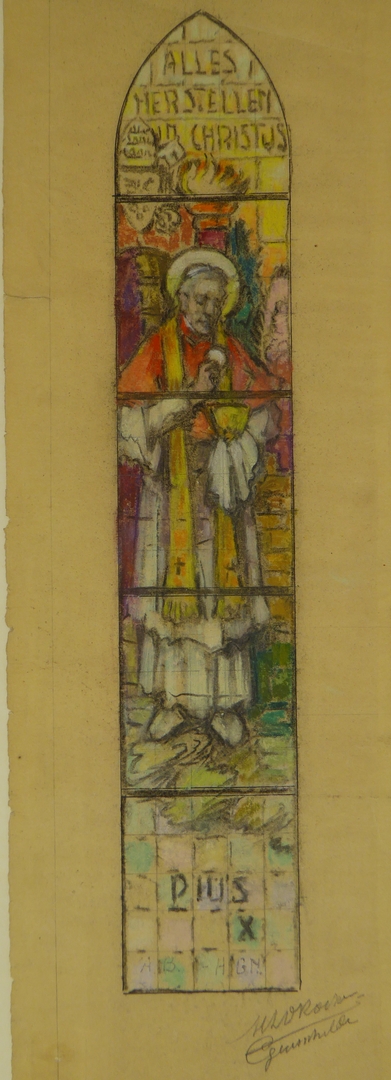 Ontwerp glasraam met Pius X met "Alles herstellen in Christus"