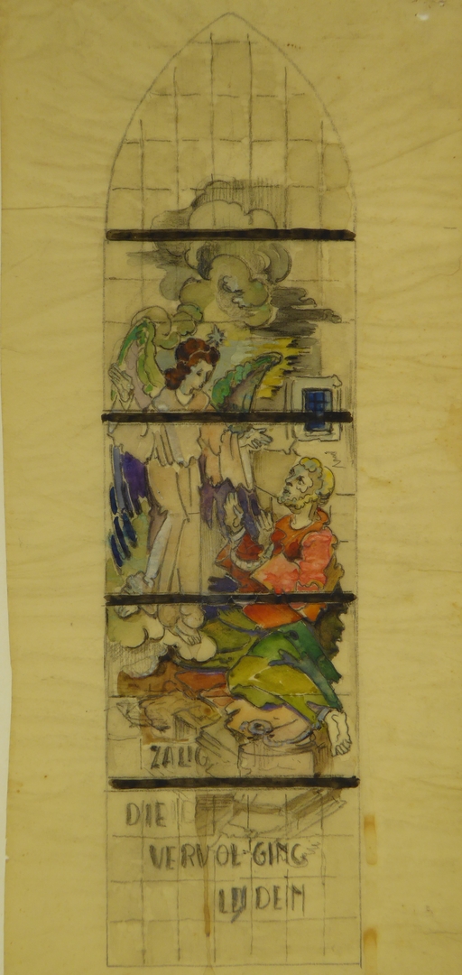 Ontwerp glasraam met "Zalig die vervolging lijden"