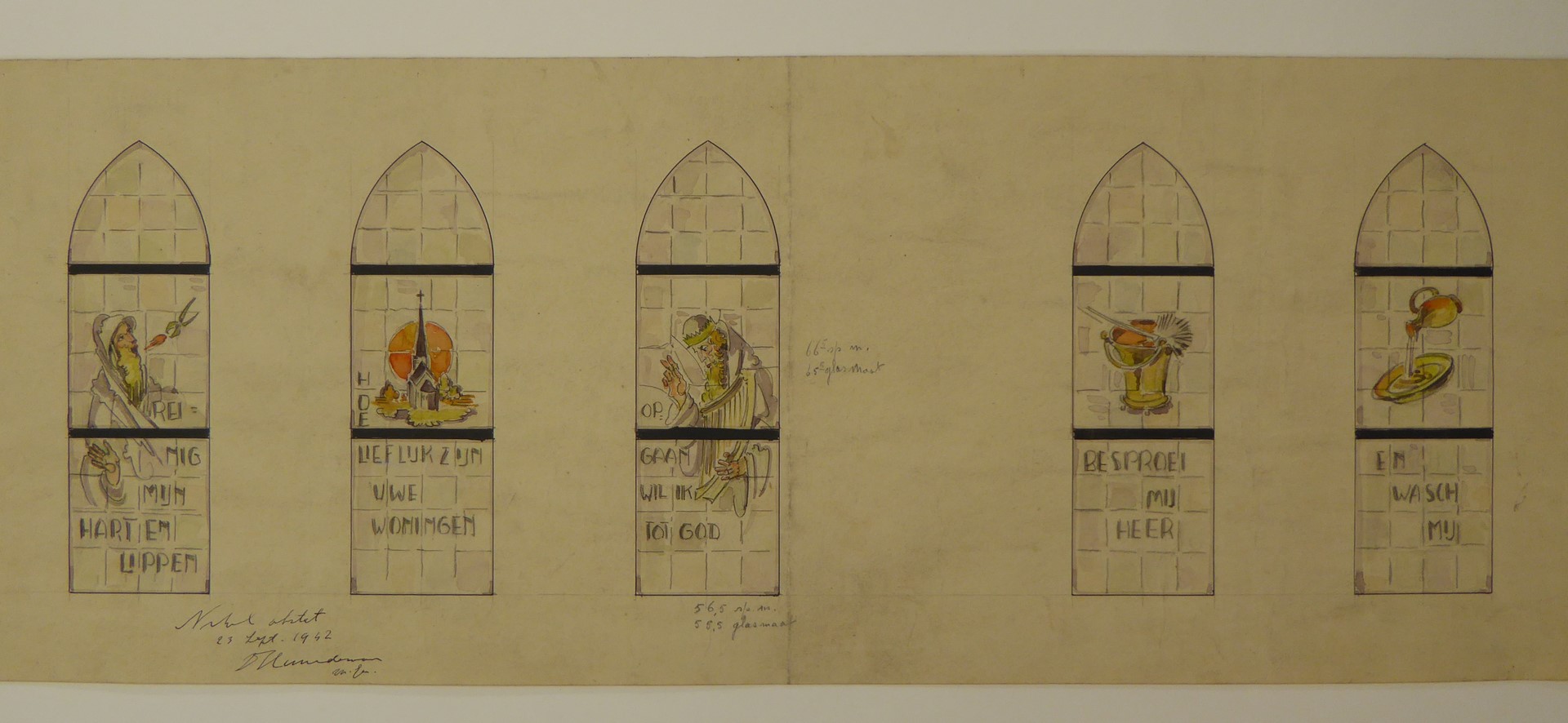 Ontwerp vijf glasramen met onder andere koning David