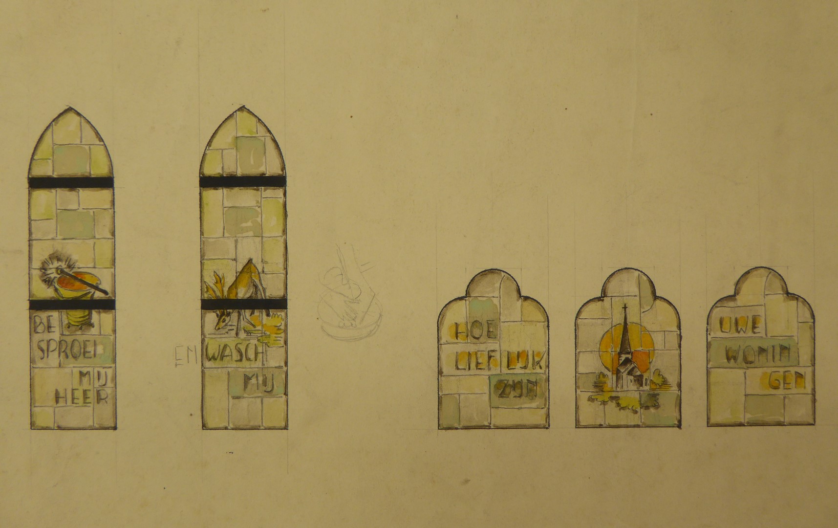 Ontwerp vijf glasramen met onder meer "Besproei mij Heer" en "Wasch mij"