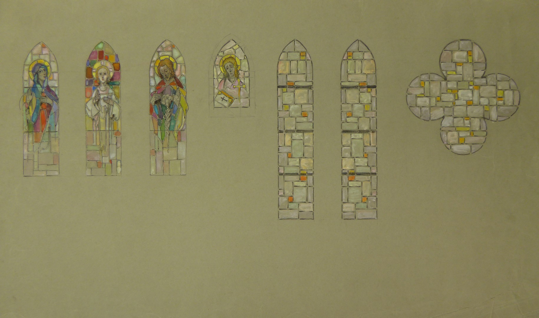 Ontwerp zeven glasramen met ondere meer Maria, Jozef en twee maal Christus
