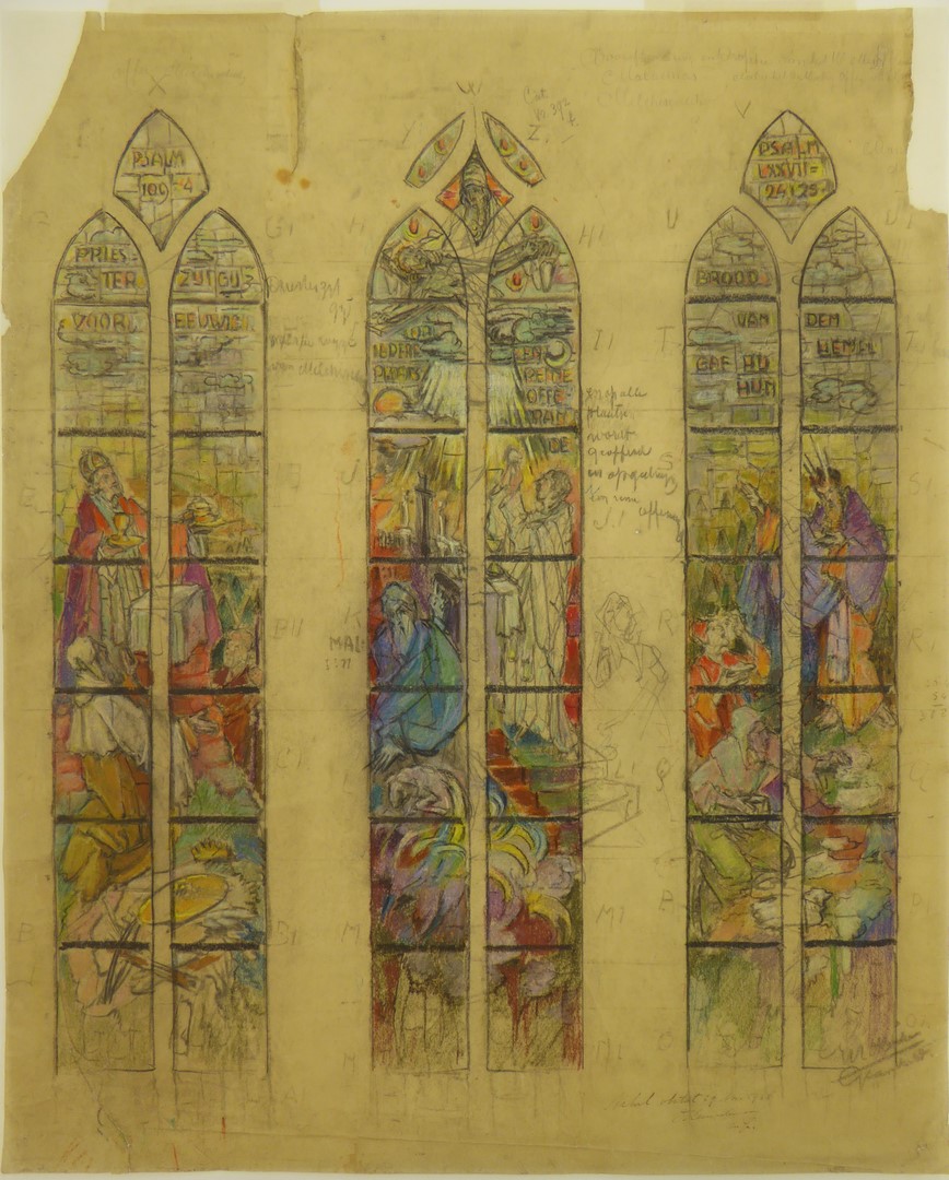 Ontwerp drie glasramen met o.a. offer Melchisedek en Mozes en het manna (Winschoten, St. Vituskerk)