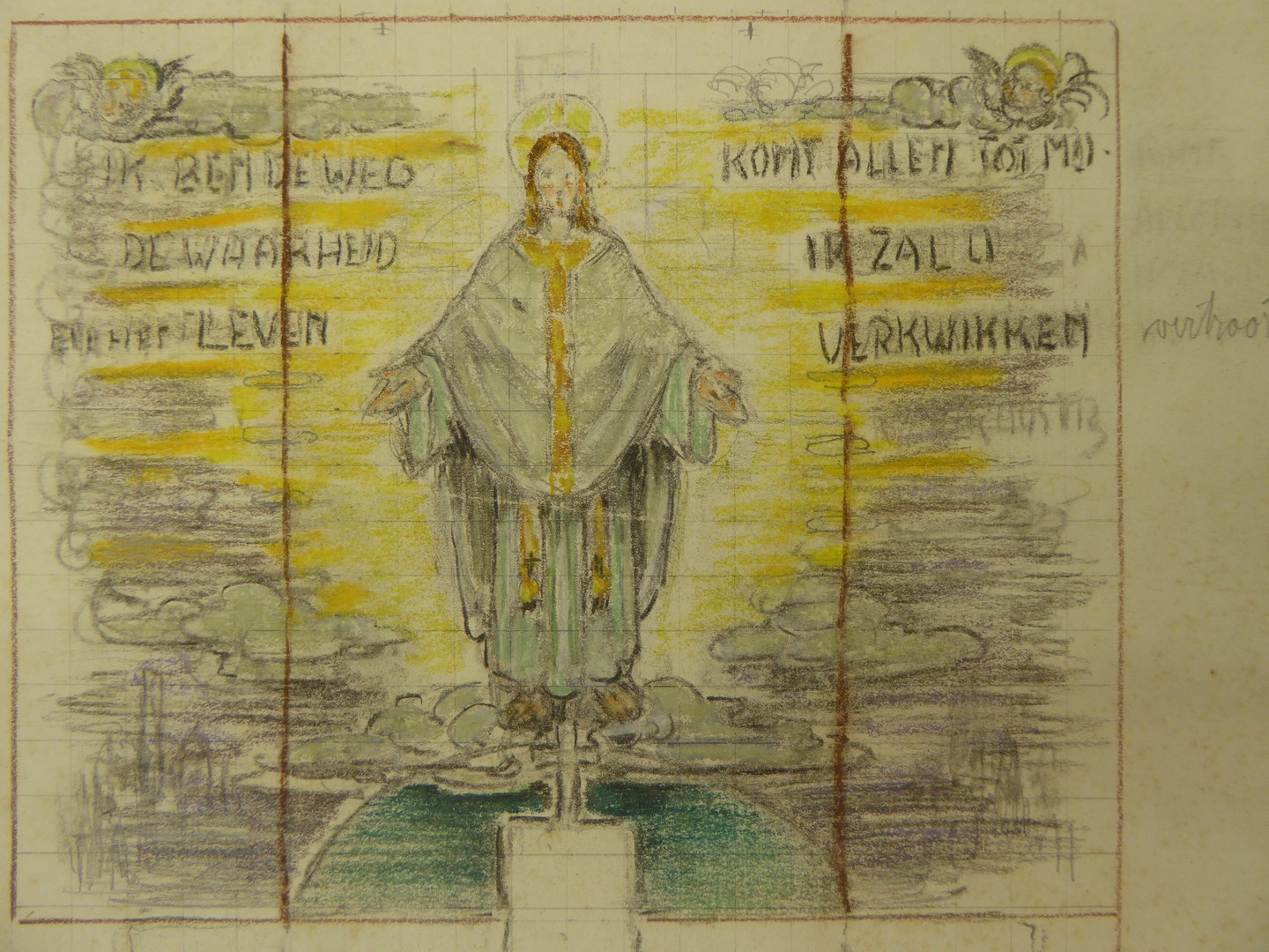 Ontwerp altaarstuk of glasraam achter altaar met Christus op wereldbol