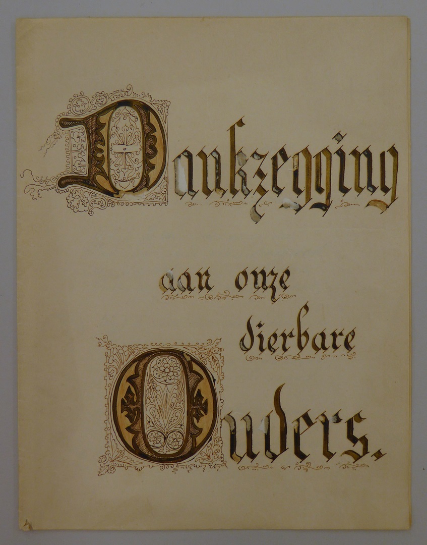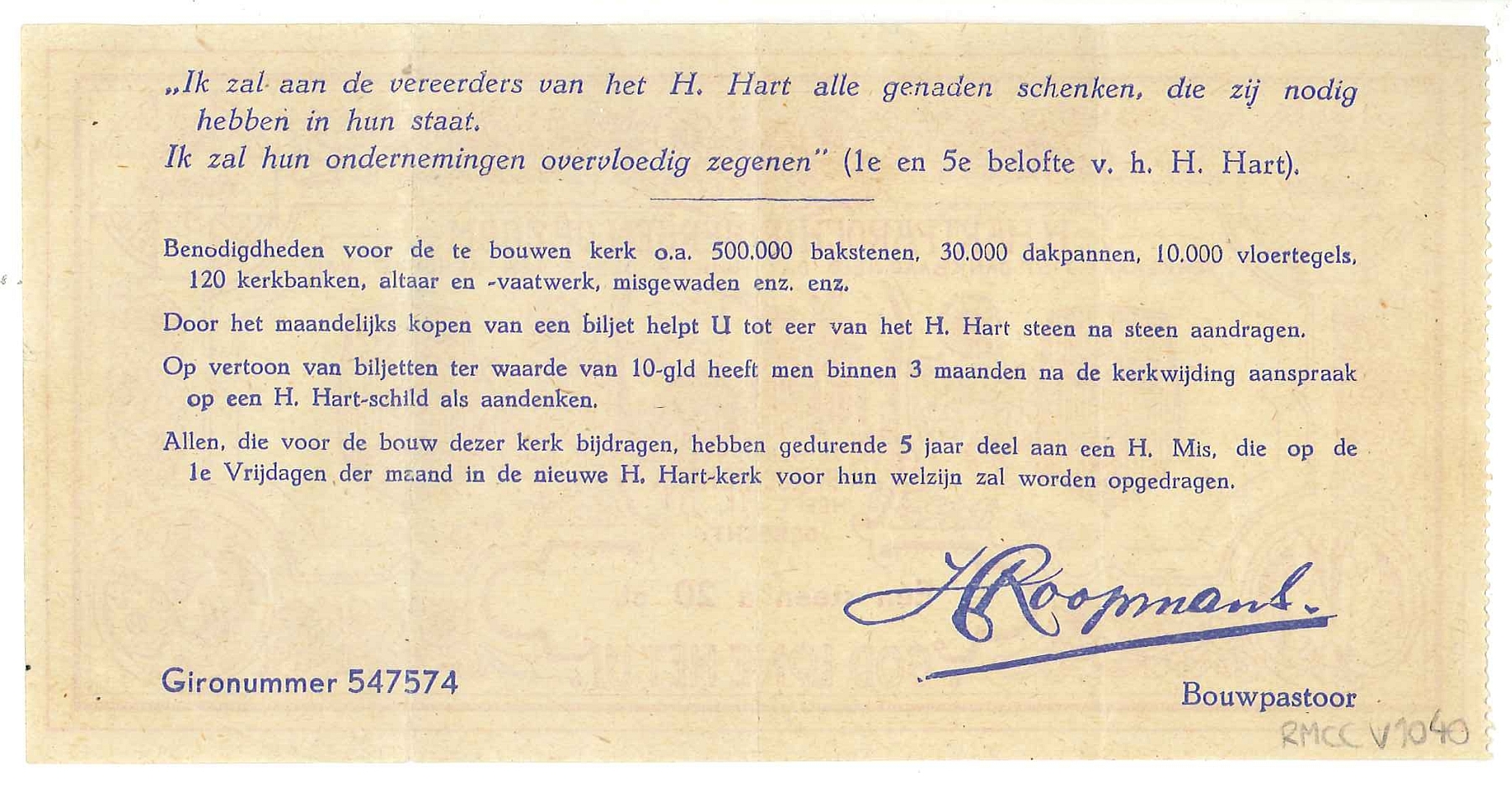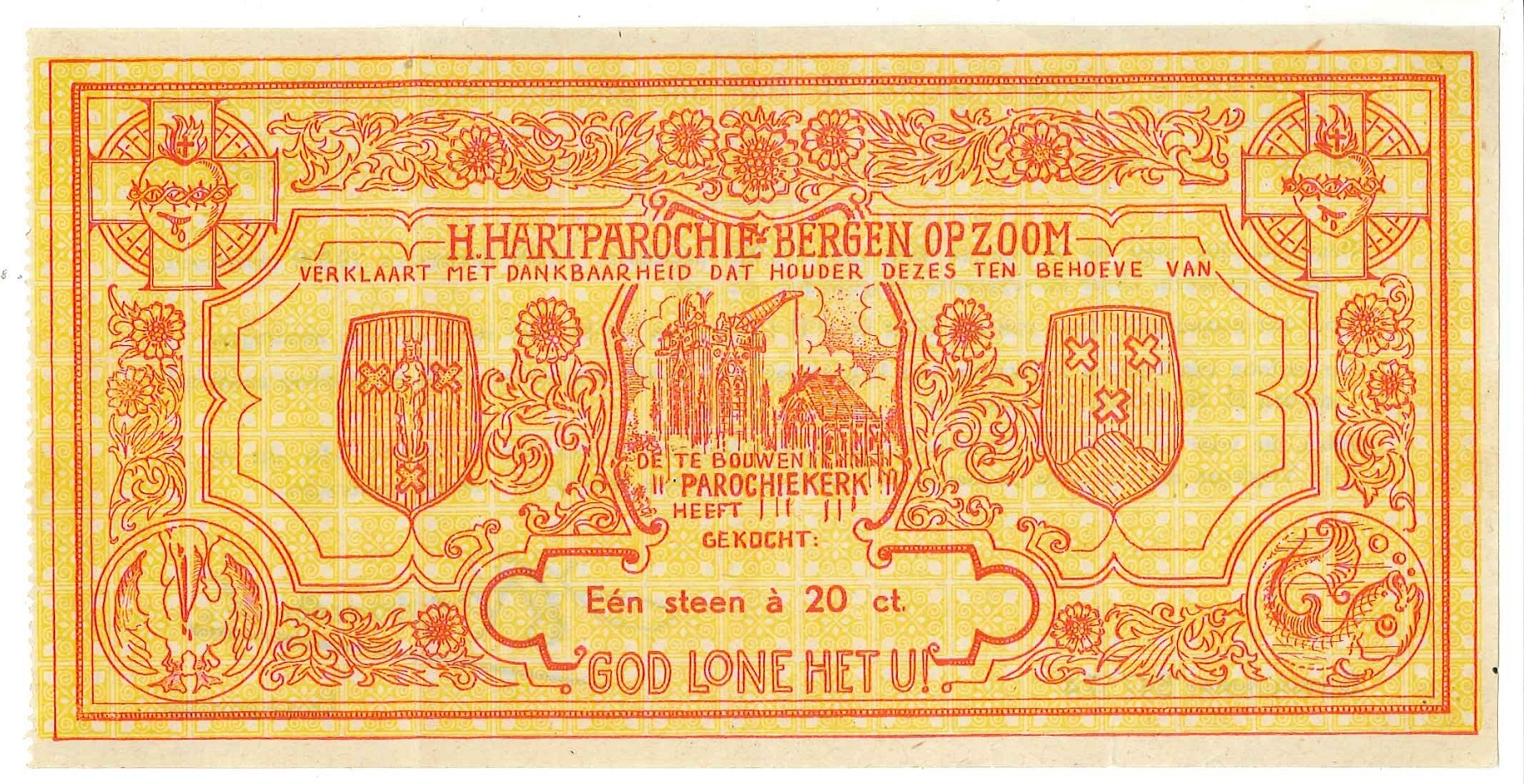 Biljet met "H. Hartparochie Bergen op Zoom verklaart met dankbaarheid dat houder dezes ten behoeve van de te bouwen parochiekerk heeft gekocht: Eén steen à 20 ct. God lone het u!" Centraal een voorstelling van een kerk in aanbouw. Links ervan het wapen van de parochie en rechts ervan het wapen van Bergen op Zoom. ...